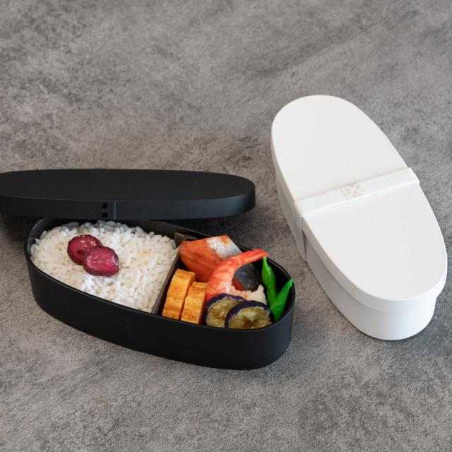 白と黒のモノトーンでおかずが映えるわっぱ弁当