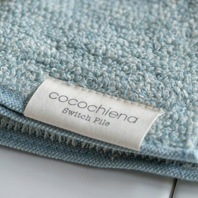 タオルのカラーに馴染む「cocochiena」のおしゃれなタグが付いています。