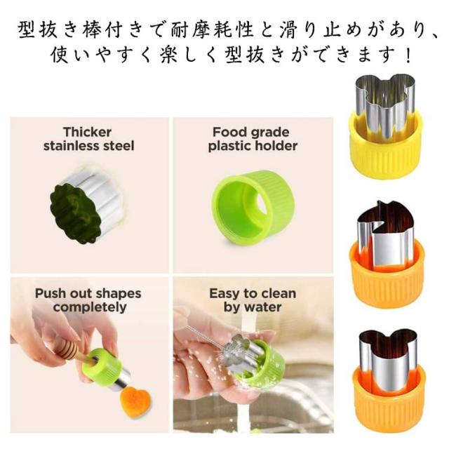 | かわいい楽しく作ろう♪ 抜き型27点セット 動物フォーク+型抜き棒付き イルカ、恐竜、星、ハート、菊、桜、魚、蝶、雛、鼠、ユニコーン、アザラシなど16種類のセットで、保育園、お家でのクッキングに便利! 型抜き棒付きで耐摩耗性と滑り止めがあり、使いやすく楽しく型抜きができます! またキャップ付きで手が痛くならず、野菜ぬきができます。 汚れの落としやすいステンレス製で引き裂きやすく、掃除が簡単。 透明な包装ケースで収納にもプレゼシトにも最適! | |