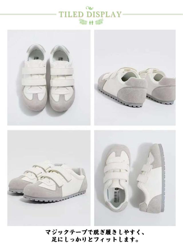 | 滑り止め加工も施され、長時間歩いても疲れにくい。 マジックテープで脱ぎ履きしやすく、足にしっかりとフィットします。 デイリーユースはもちろん、通学用・ウォーキングシューズにもオススメです。 さっと履けて楽チン、カジュアル感たっぷりのファッションアイテム。 | |