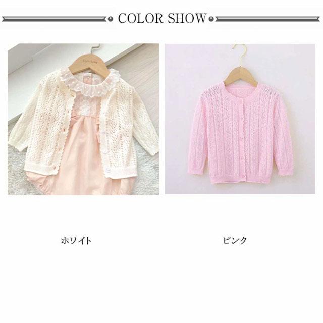 | 季節の変わり目の羽織りアイテムとしてはもちろん、夏の冷房対策にも重宝する前開きカーディガンです。女の子のお気に入ったカラーやベビーからキッズまで着用できる幅広いサイズをご用意して、姉妹や友達お揃いにもおすすめ。 薄手で肌に優しい綿100%を使用した長袖カーディガンが、吸汗・通気性にも優れ、サラッとした着心地です。伸縮性があって動きやすいのも嬉しいポイントです。丈夫で型崩れしにくいため、ご家庭でのお洗濯にも適しています。 シンプルなカーディガンに透かし彫りデザインを施して女の子らしい優しい雰囲気を演出します。フロントは前開きなので着脱や重ね着にもしやすいです。ボタンを開ければ、便利な上着になっています。寒い時期にはアウターのインナートップスとしでも着用できます。 ほどよいフィット感&すっきりシルエットを実現します。スカートにもワンピースにもどんなお洋服にもコーデしやすくで着回し力抜群の女の子用の上着です。 無地だからコーデしやすく、春秋のちょっとした肌寒い季節や夏場のエアコン等場合に冷え対策グッズとして使えるカーディガンです。シンプルな着こなしに一枚プラスするだけできちんと見えるので、普段使い、幼稚園、保育園などの通園や部屋着にもオススメです。 | |