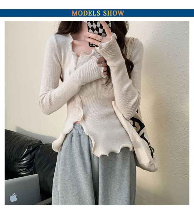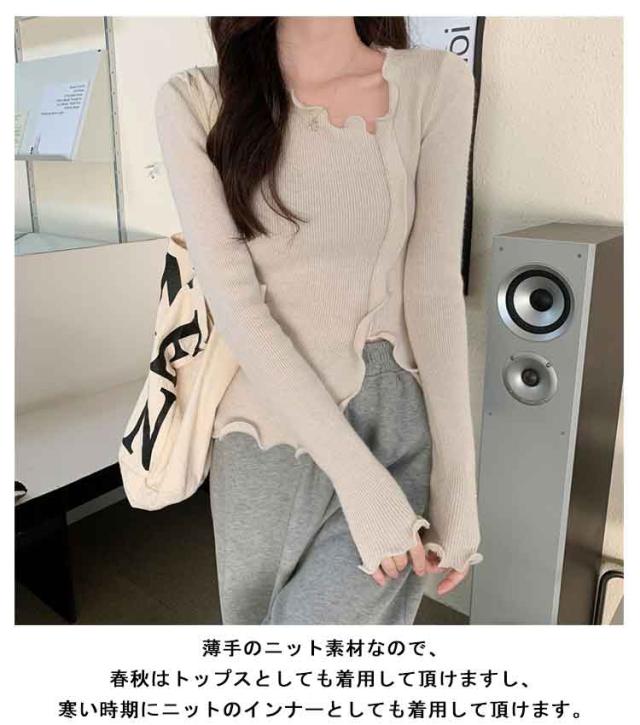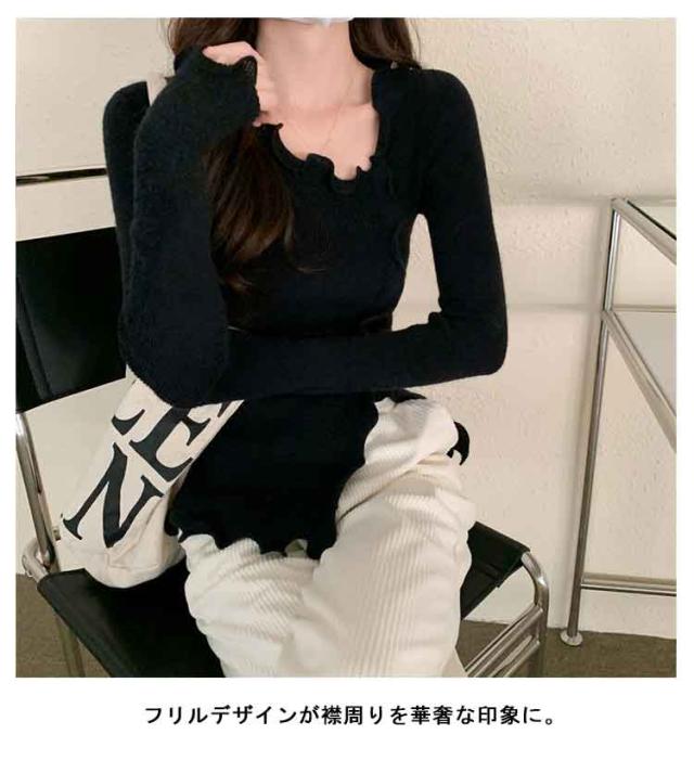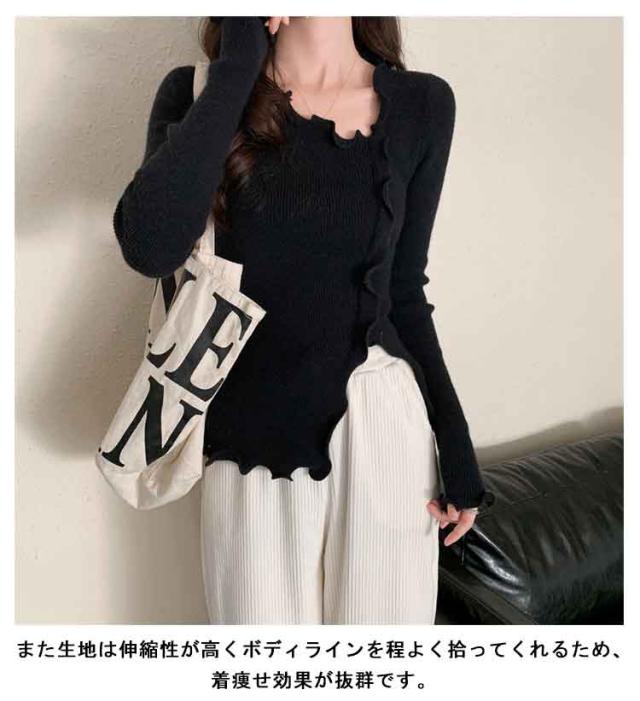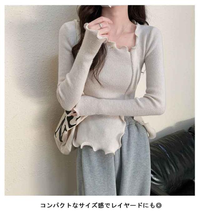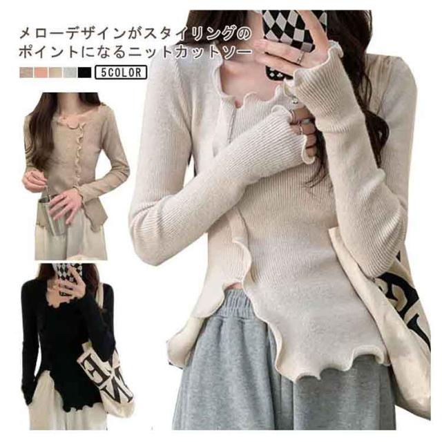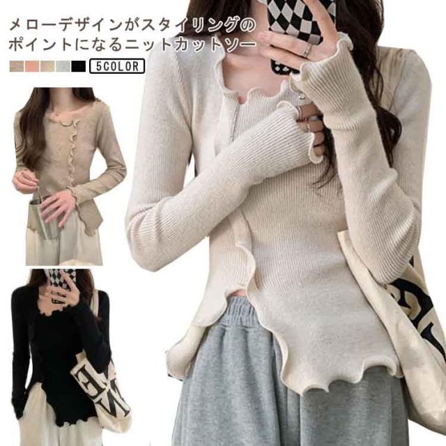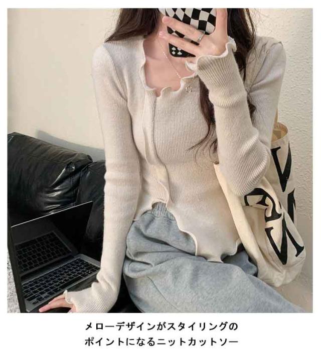 | メローデザインがスタイリングのポイントになるニットカットソー 薄手のニット素材なので、春秋はトップスとしても着用して頂けますし、寒い時期にニットのインナーとしても着用して頂けます。 コンパクトなサイズ感でレイヤードにも◎ 裾スリットにより、一枚で着るだけでオシャレな印象を与えます。 また生地は伸縮性が高くボディラインを程よく拾ってくれるため、着痩せ効果が抜群です。 フリルデザインが襟周りを華奢な印象に。 サイドにスリットを入れることでハイウエストのボトムスとのコーディネートにも合わせやすいです。 | |
