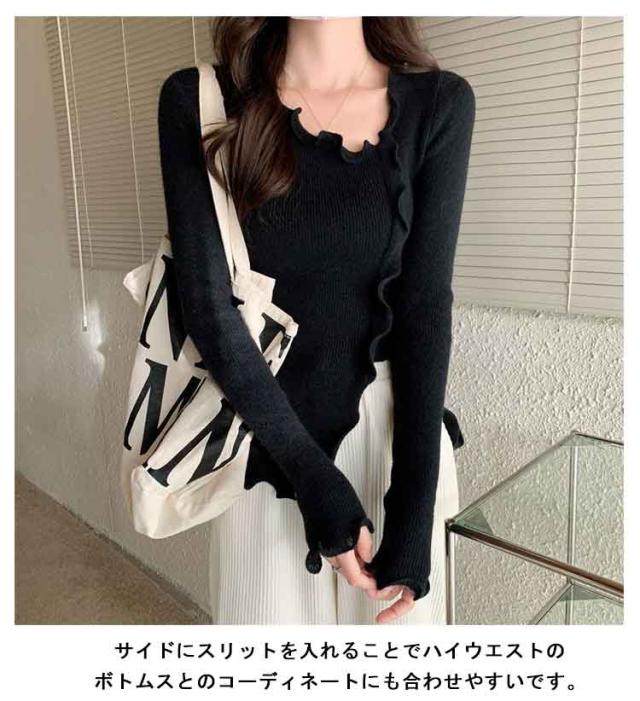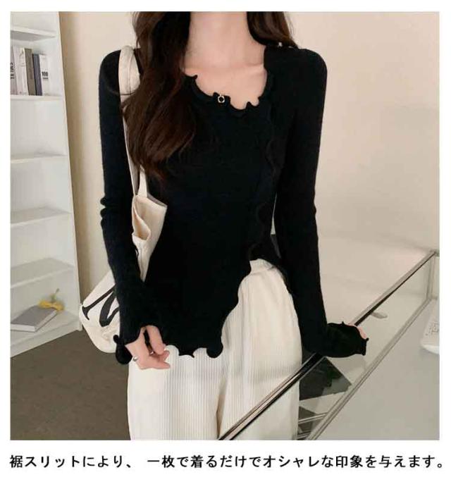 カットソー 長袖 レディース 体型カバー ニットカットソー Tシャツ ニットソー トップス プルオーバー 重ね着 可愛い 薄手 セーター メロー フリル Vネック 無地 スリット スリム 伸縮性 カジュアル きれいめ 春秋 秋服 送料無料 大きいサイズ