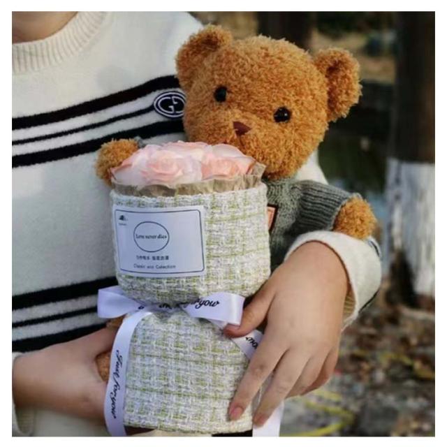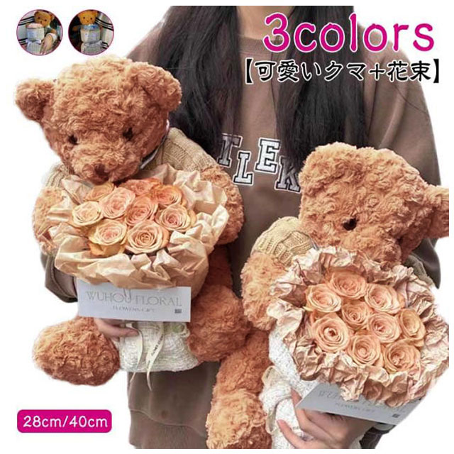 | 【可愛いクマ+花束】【3colors】【28cm/40cm】 温かい気持ちが伝わる花。手入れが不要で、枯れない、花粉症の心配なし。 ソープフラワーがボリュームがあり、見栄えが良い。SNS映え間違いなし! 結婚祝い ・ 誕生日祝い ・出産祝い・還暦祝い・退職祝い ・発表会・記念日等のプレゼントとしておすすめです。 | |