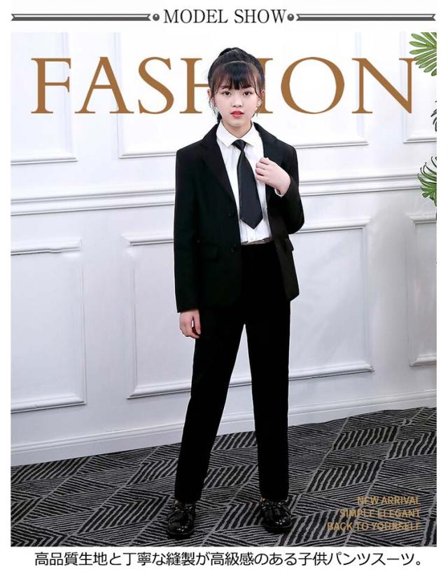| 女の子のブラックパンツスーツ。 4点セット・120〜160cm 高品質生地と丁寧な縫製が高級感のある子供パンツスーツ。 クールでかっこいい、スカートが苦手な子にお勧めのパンツスーツ。 形態安定加工&シワになりにくい上品なスーツ。 入学式、卒業式、お受験、発表会、七五三、お宮参り、結婚式、パーティーなどイベントにピッタリのフォーマルスーツ。 | |