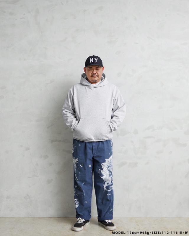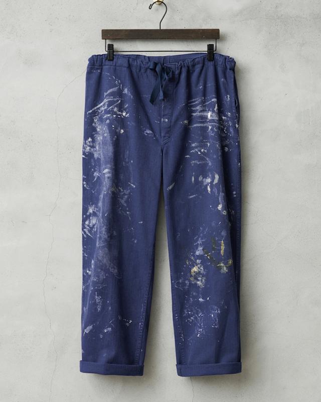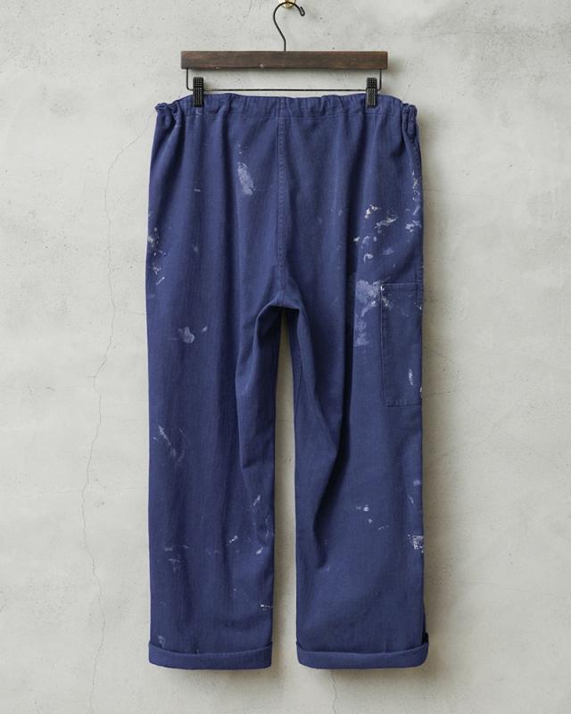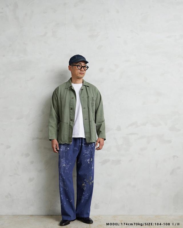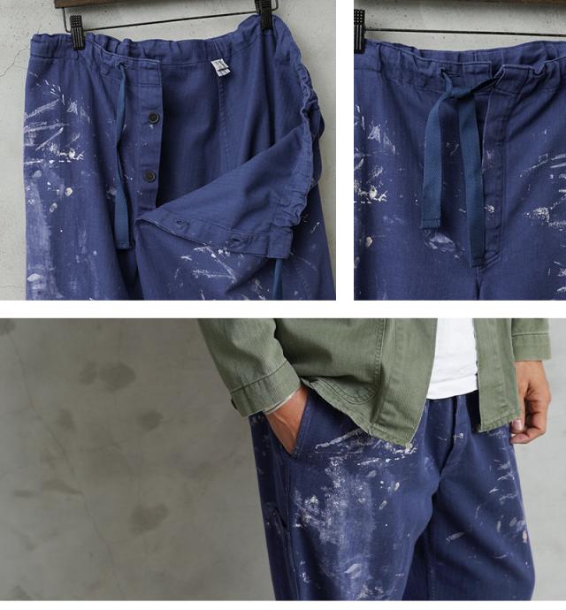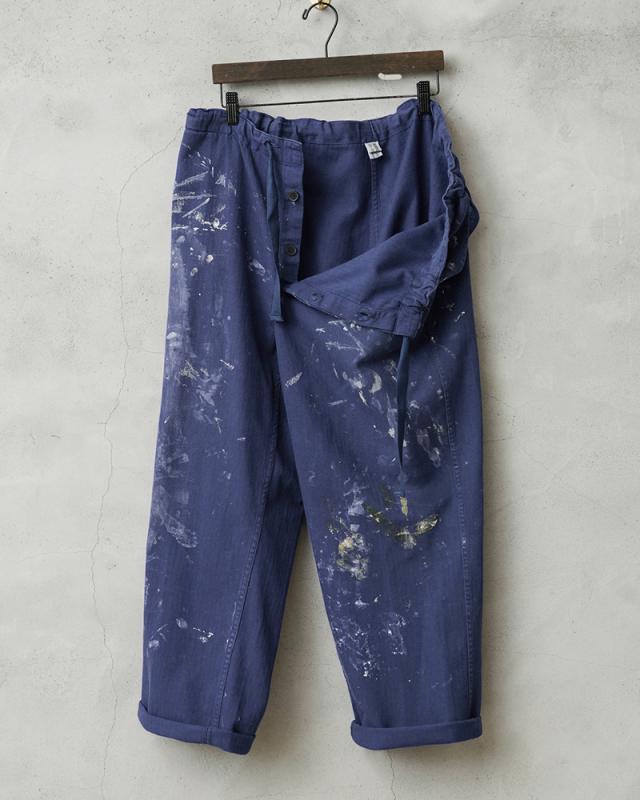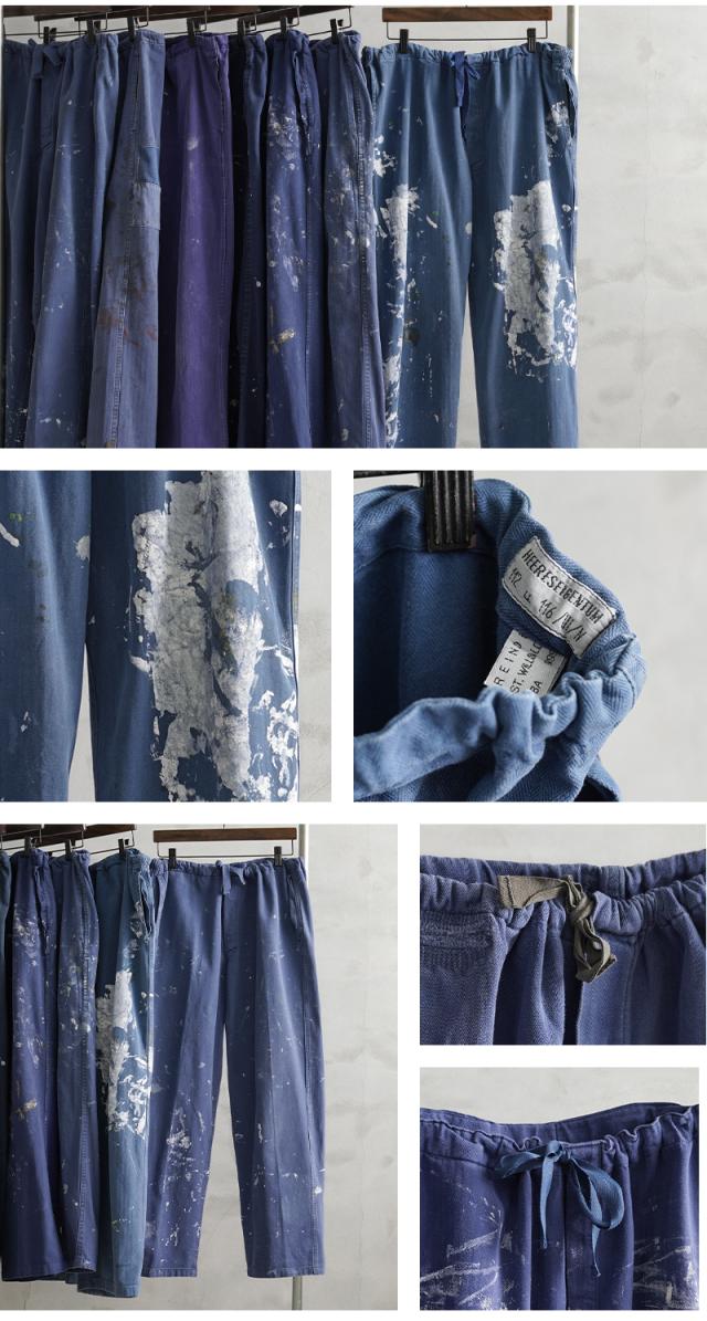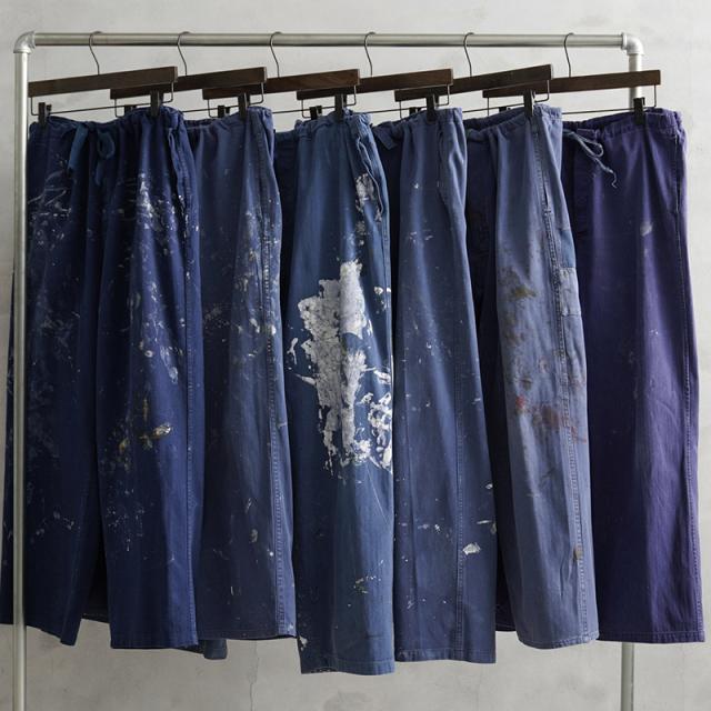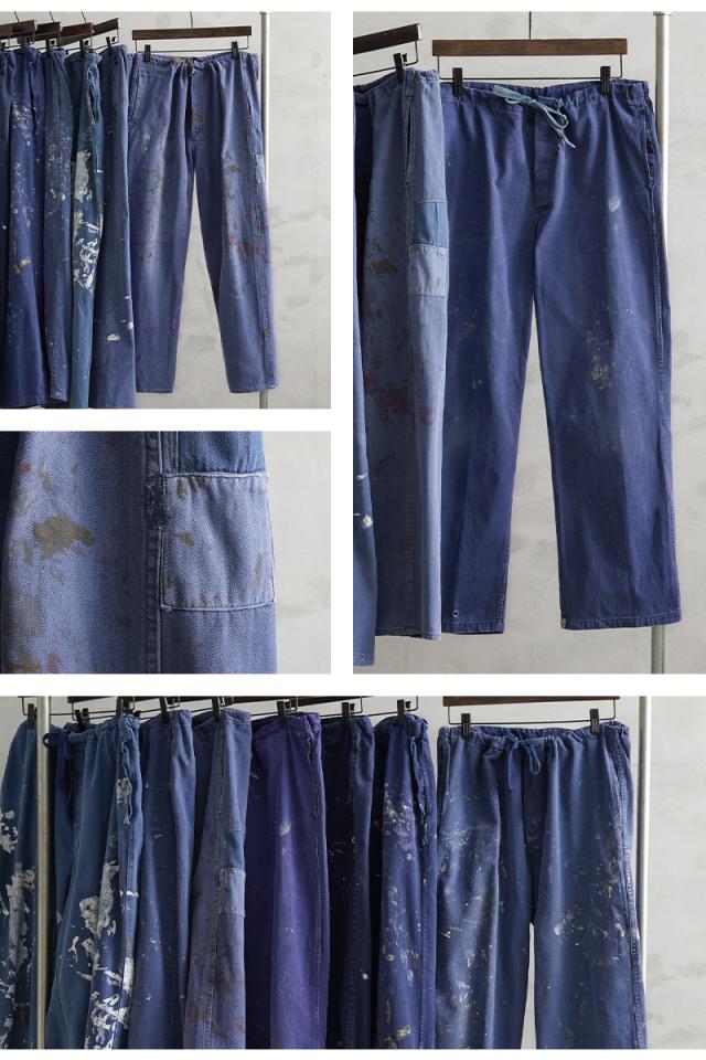 HBTの織り模様が浮き上がるくらいに着こまれ、まるでデニムのように良い色落ちに仕上がっているもの、大胆なペンキ跡や別布で施されたリペア跡がまるでウォールアートのようになっているものなど表情は様々ですが、非常に雰囲気のあるアイテムです。