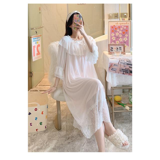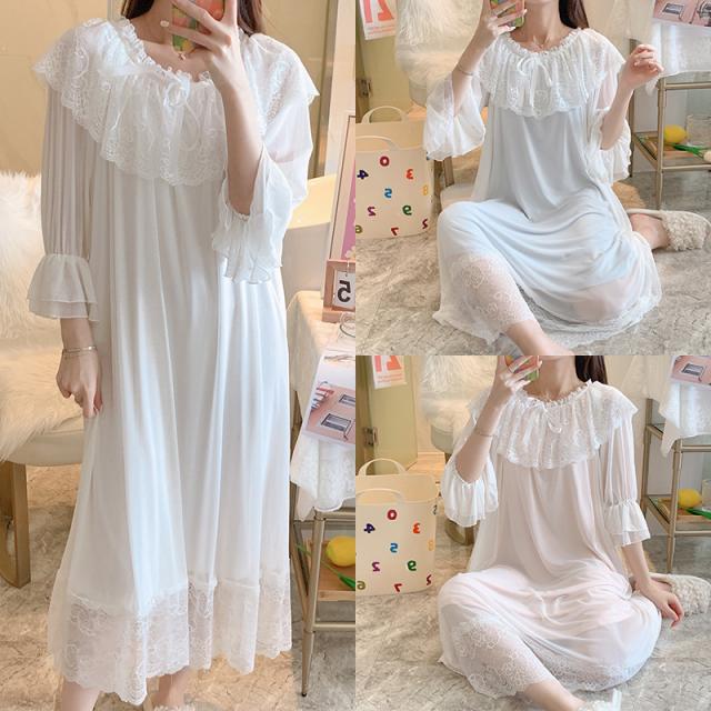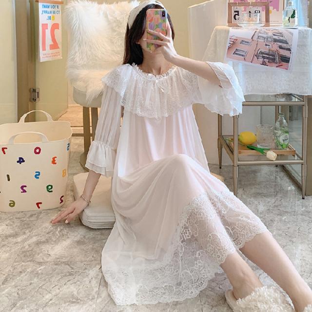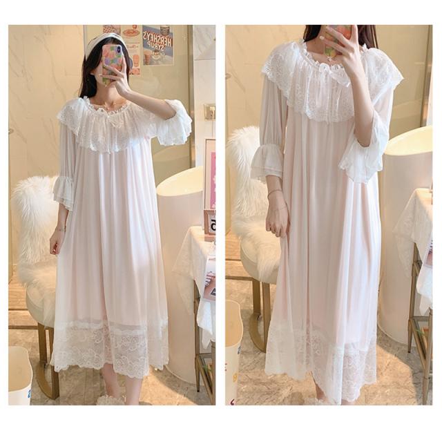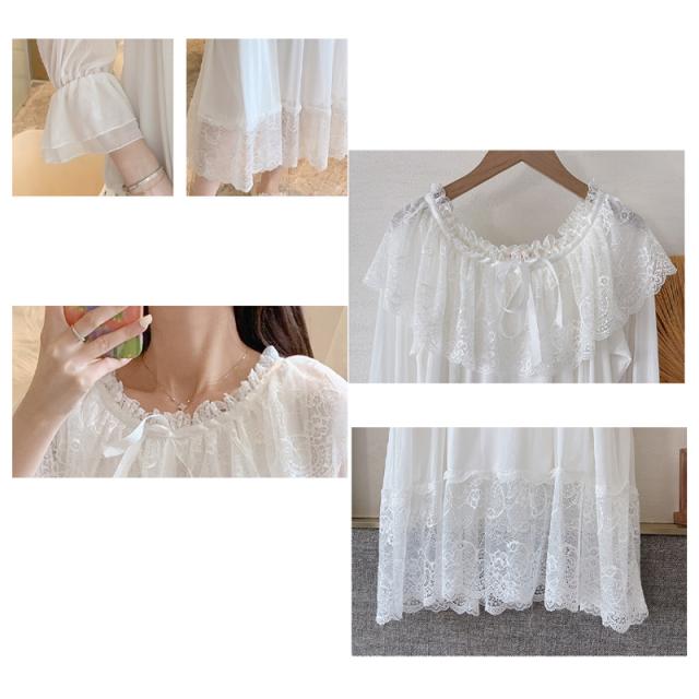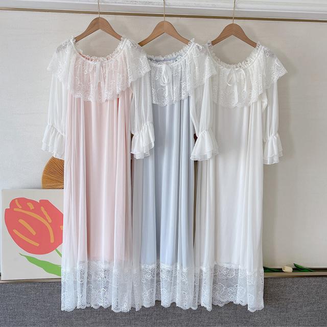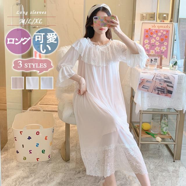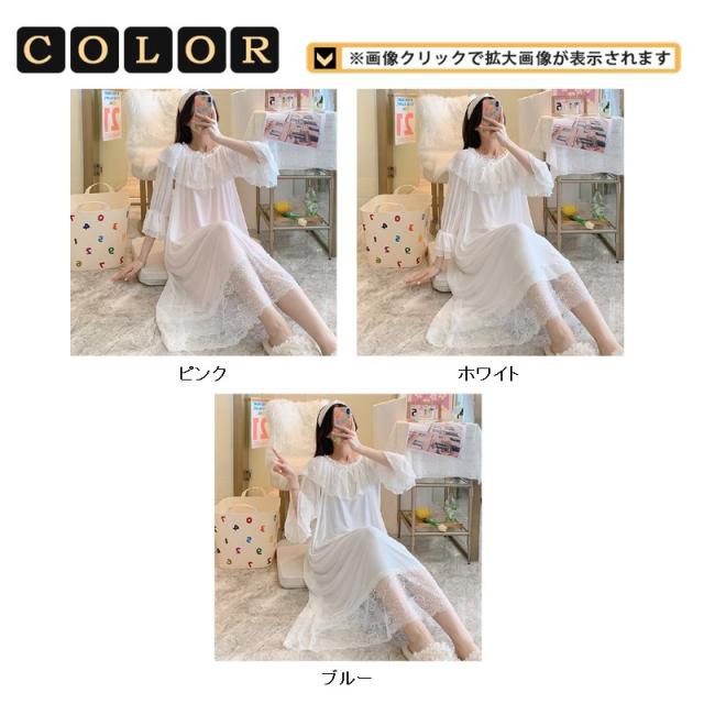 3色!春夏新作 レディース フリル チュール 姫系 ネグリジェ 寝巻きロング丈 レース ルームワンピース パジャマ ナイトウエア ナイティー