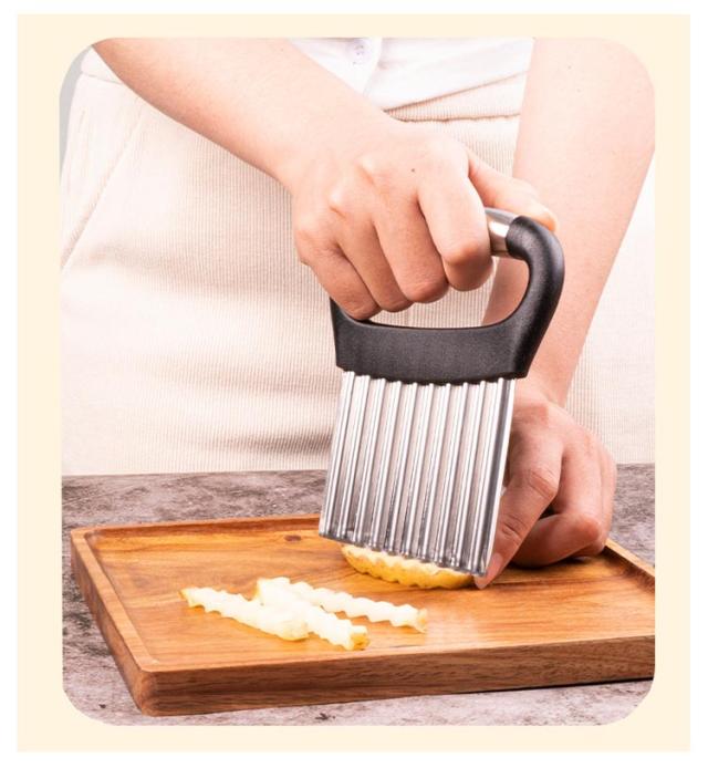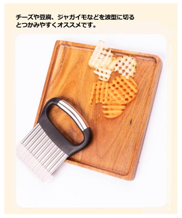 | 切り口をキレイな波型にスライスできます。 お店みたいなカッティングが家で簡単手軽に完成です。 じゃがいもをカットし揚げれば、なみなみフライドポテトに。 チーズや豆腐、ジャガイモなどを波型に切るとつかみやすくオススメです。 | |