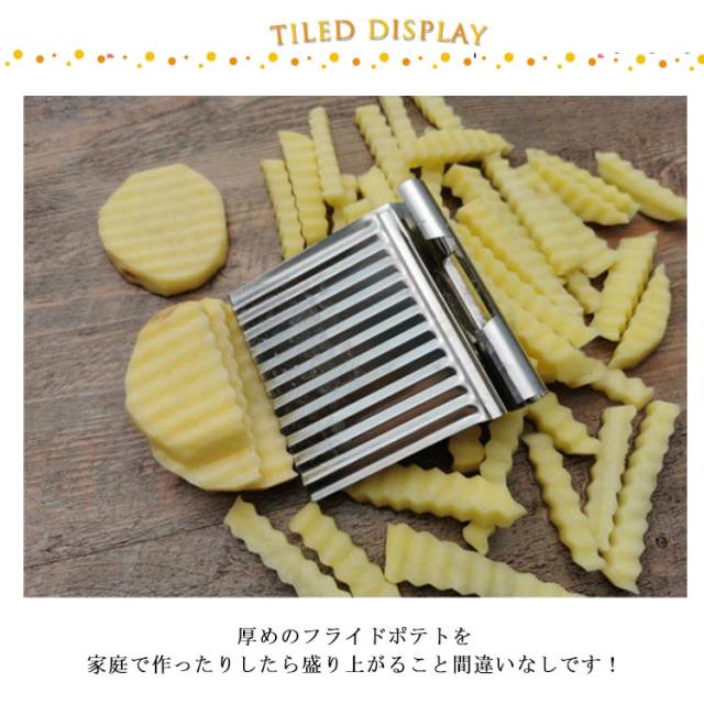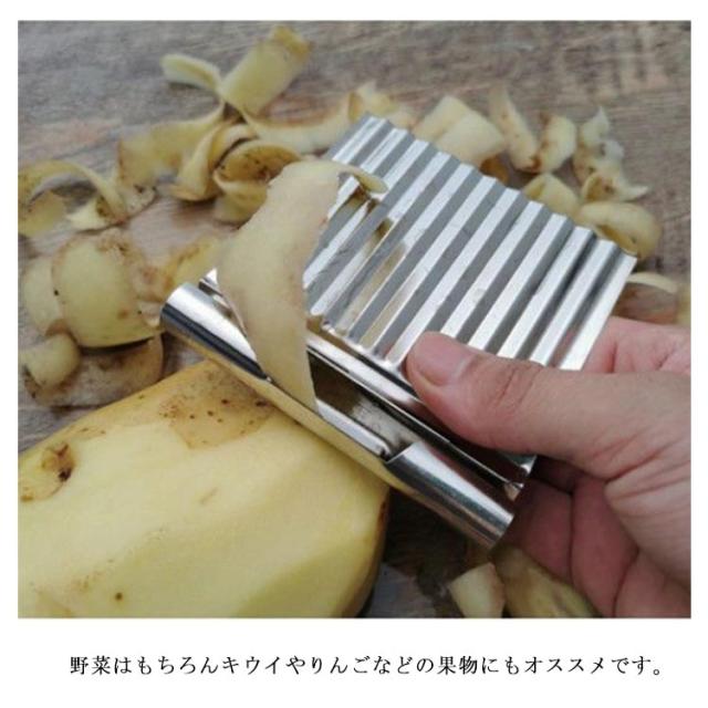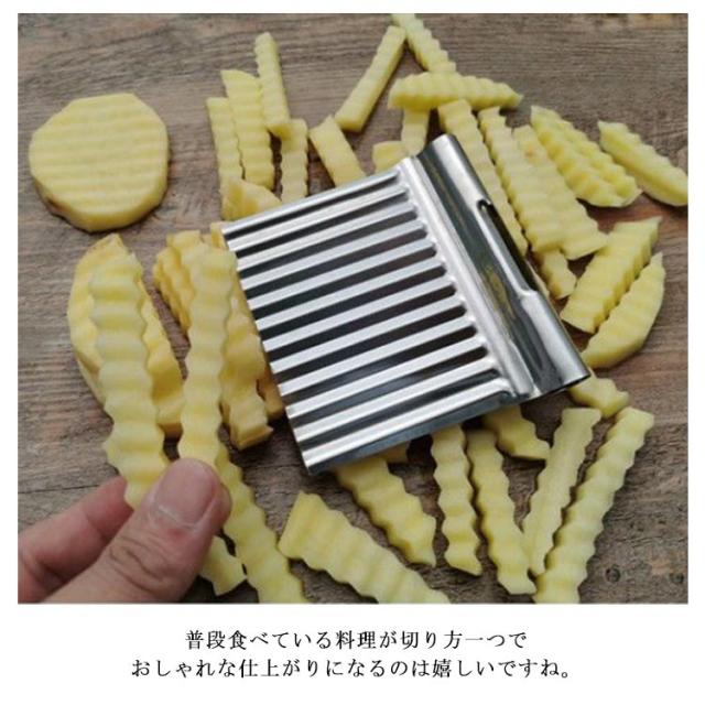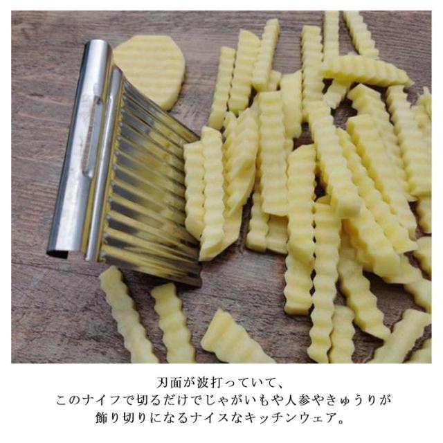 | 厚めのフライドポテトを家庭で作ったりしたら盛り上がること間違いなしです! 刃面が波打っていて、このナイフで切るだけでじゃがいもや人参やきゅうりが飾り切りになるナイスなキッチンウェア。 普段食べている料理が切り方一つでおしゃれな仕上がりになるのは嬉しいですね。 野菜はもちろんキウイやりんごなどの果物にもオススメです。 | |