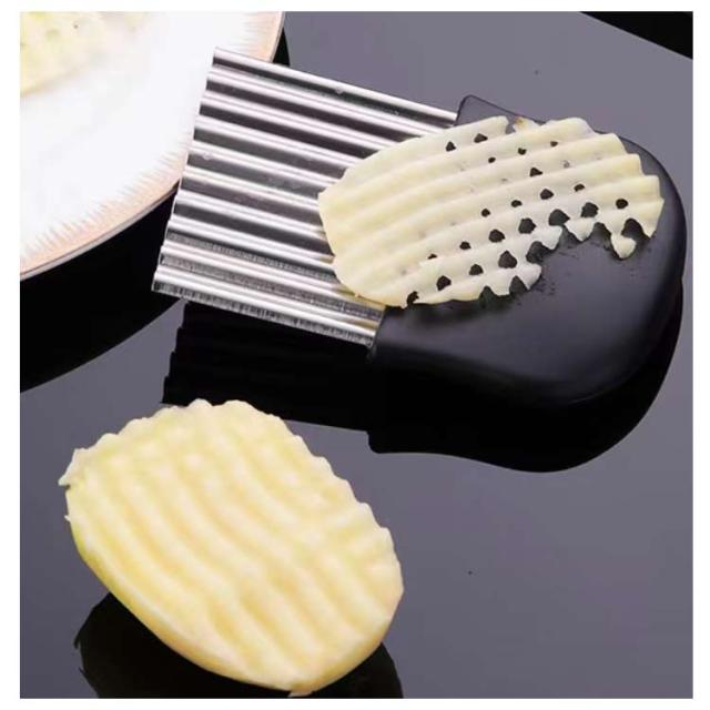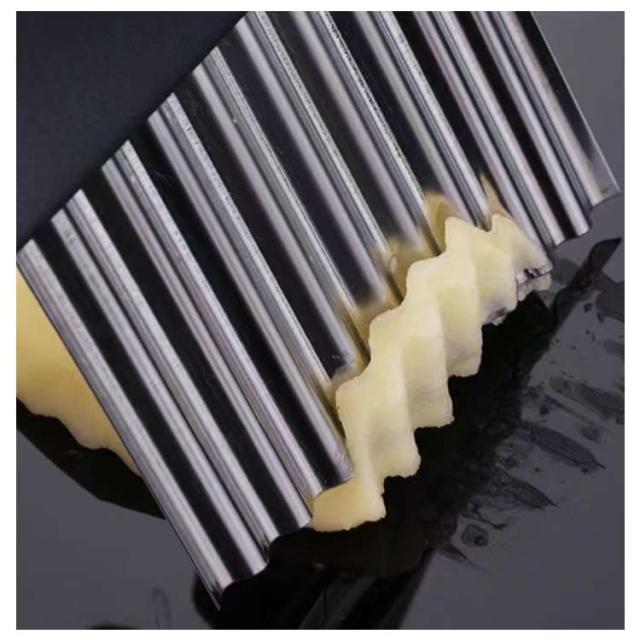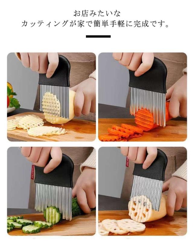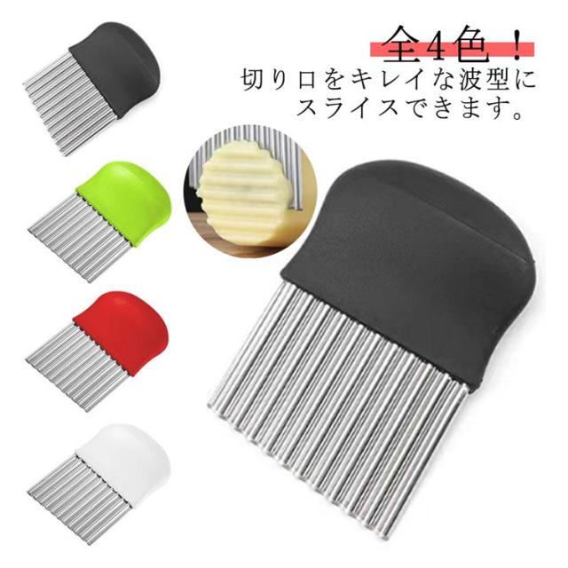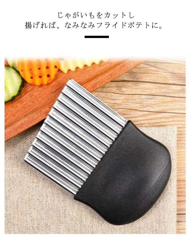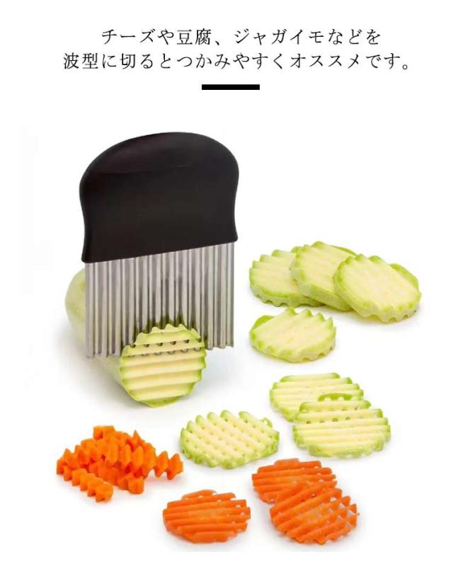 | 切り口をキレイな波型にスライスできます。 じゃがいもをカットし揚げれば、なみなみフライドポテトに。 お店みたいなカッティングが家で簡単手軽に完成です。 チーズや豆腐、ジャガイモなどを波型に切るとつかみやすくオススメです。 | |