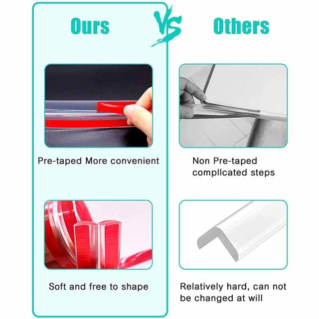 ・ソフトで透明感コーナーグラッドテープは幅10x10mm、長さ6m、厚さ2.5mmです。4つのコーナークラッドプロテクターは40x40x15mmです。この透明なシリコーン素材のコーナーは、家具の元の外観を維持するために家具の一部のようなもので、子供たちのために厚い衝撃点より柔らかい柔軟性を提供する。
