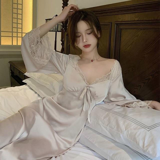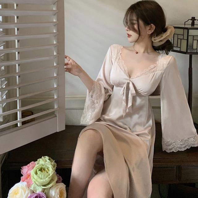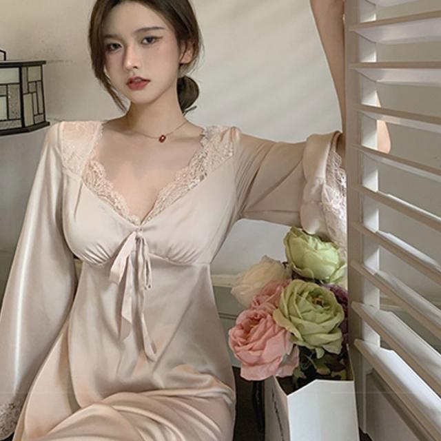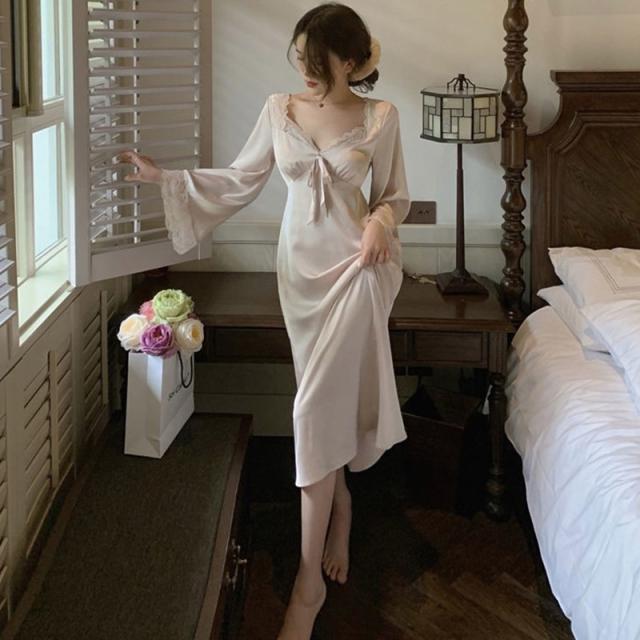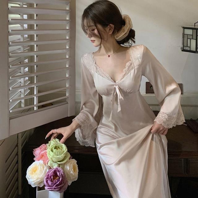 ネグリジェ 春夏秋 長袖ネグリジェ 姫風ワンピース ロング丈 レースVネックネグリジェ ナイトロープ ルームウェア レションパジャマ レディース 大人