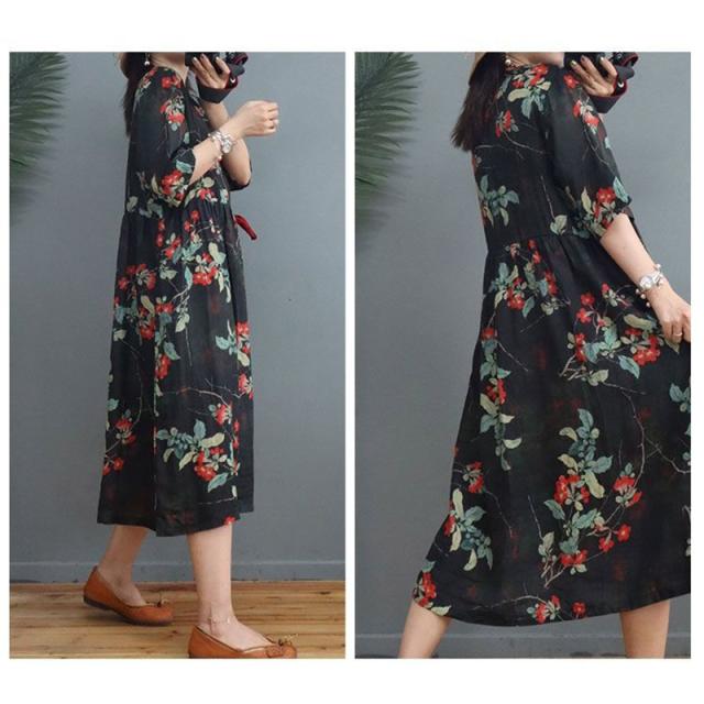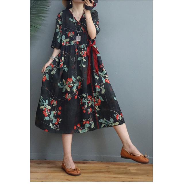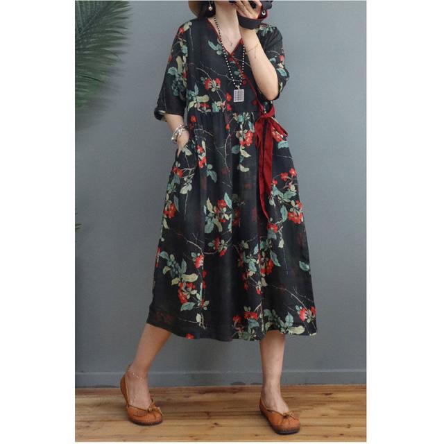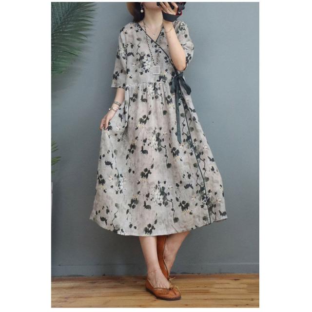 ワンピース 秋 ロングワンピース 綿麻 花柄 プリント リゾート 半袖 大きいサイズ カジュアル 大人 春 夏 ゆったり 体型カバー おしゃれ