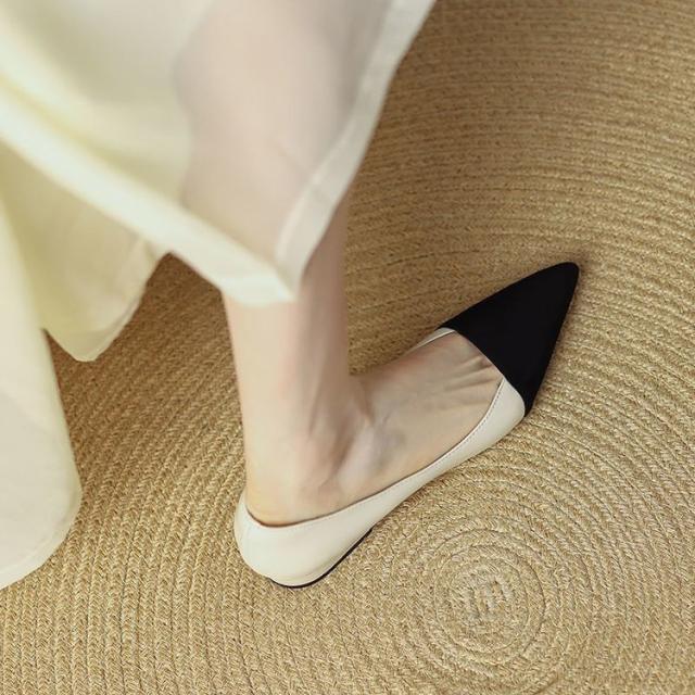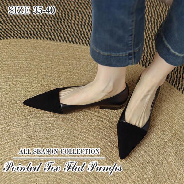 すらりとしたつま先と切り替えデザインが足元にアクセントヒールなしでも美脚に見えるポインテッドトゥパンプス