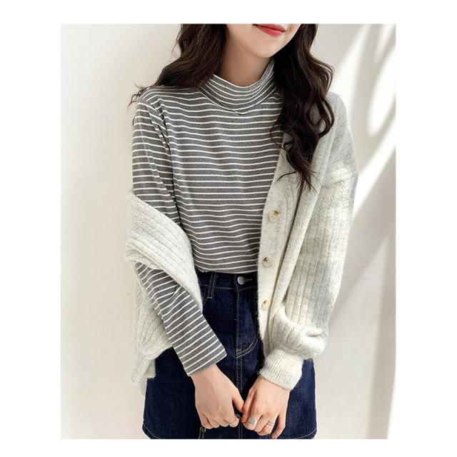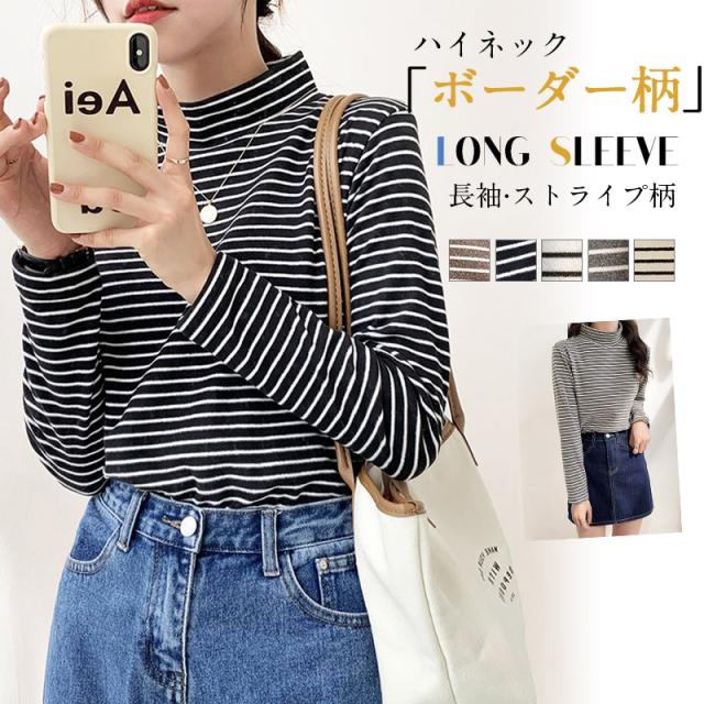 カットソー レディース ハーフハイネックトップス インナー 春コーデ 長袖 ロングtシャツ ストライプ柄 ボーダー タートルネックカットソー