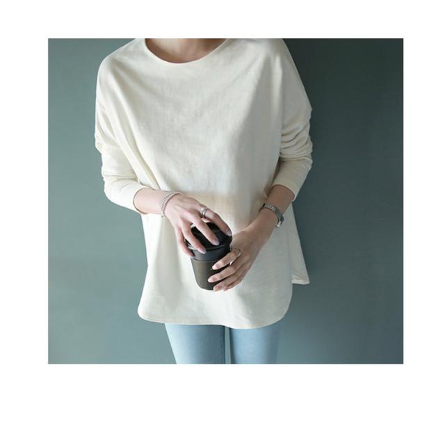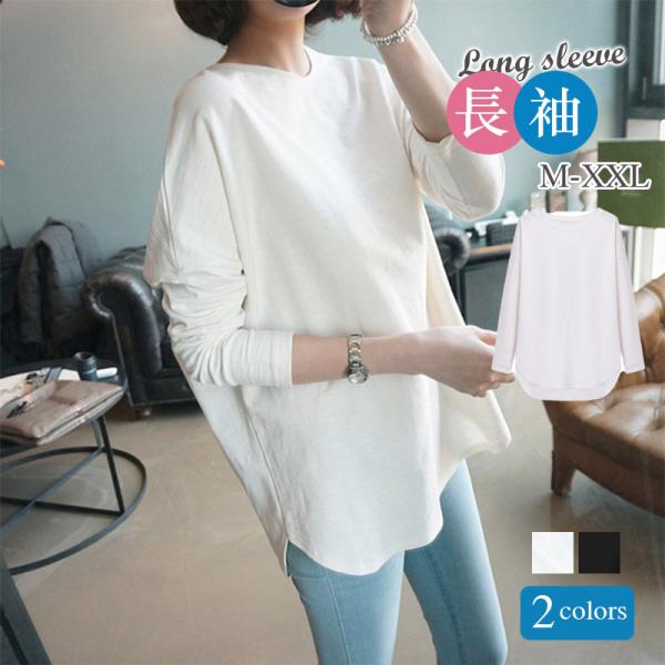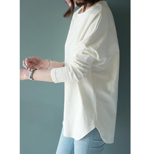 ロンティー レディース カットソー ロングTシャツ レディース ゆったり ラウンドカット 無地 長袖 トップス クルーネック やわらか Tシャツ