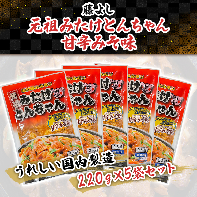 商品名 藤よし 元祖みたけとんちゃん甘辛みそ味 220g×5袋セット 容量 220g×5袋 原材料名 豚内臓(大腸、小腸、直腸、胃袋)(国産)、とんちゃんのたれ【味噌、水飴、砂糖、醤油、にんにく、りんごパルプ、発酵調味料、食塩、豆板醤、ごま、カツオエキス、ごま油、唐辛子、昆布エキス】、味噌/調味料(アミノ酸等)、着色料(カラメル)
