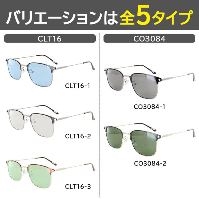 | ●カラー CLT16-1 フレーム:ブラック・ガンメタル レンズ:ライトブルー偏光 CLT16-2 フレーム:ブラック・ガンメタル レンズ: ライトスモーク偏光 CLT16-3 フレーム:ブラウンデミ・ゴールド レンズ:ライトグリーン偏光 CO3084-1 フレーム:ブラック・ガンメタル レンズ: スモーク偏光 CO3084-2 フレーム:ブラック・ゴールド レンズ: グリーンスモーク偏光 | ●素材 フレーム:ニッケル合金 テンプル:ニッケル合金 レンズ:プラスチック(偏光レンズ)(コーティング) ●可視光線透過率 CLT16-1 45% CLT16-2 55% CLT16-3 50% CO3084-1 20% CO3084-2 15% ●機能 バネ丁番 フレキシブルノーズパッド フレキシブルイヤーパッド 偏光レンズ |