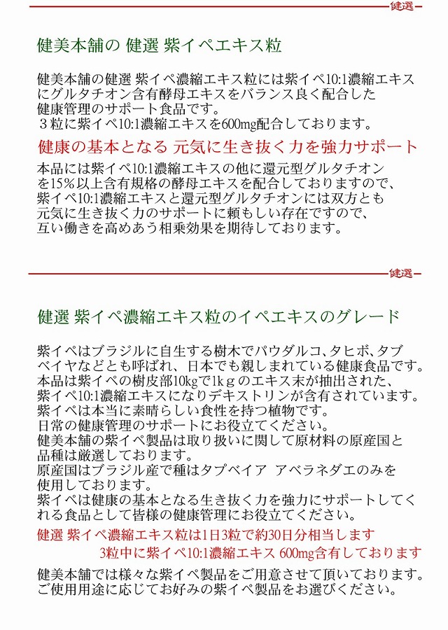 紫イペ10倍濃縮エキスとグルタチオン含有酵母エキスの粒 健康の基本となる生き抜く力を強力にサポートしてくれる 紫イペ濃縮エキスにグルタチオン含有酵母エキスをバランスよく配合しました 紫イペエキスと天然グルタチオンの相乗効果で健康をアシスト 健選 紫イペ濃縮エキス粒 健美本舗の健選 紫イペ濃縮エキス粒には紫イペ10:1濃縮エキスにグルタチオン含有酵母エキスをバランス良く配合した健康管理のサポート食品です。 3粒に紫イペ10:1濃縮エキスを600mg配合しております。 健康の基本となる 元気に生き抜く力を強力サポート 本品には紫イペ10:1濃縮エキスの他に還元型グルタチオンを15%以上含有規格の酵母エキスを配合しておりますので、紫イペ10:1濃縮エキスと還元型グルタチオンには双方とも元気に生き抜く力のサポートに頼もしい存在ですので互い働きを高めあう相乗効果を期待しております。 健選 紫イペ濃縮エキス粒のイペエキスのグレード 紫イペはブラジルに自生する樹木でパウダルコ、タヒボ、タブベイヤなどとも呼ばれ、日本でも親しまれている健康食品です。本品は紫イペの樹皮部10kgで1kgのエキス末が抽出された紫イペ10:1濃縮エキスになりデキストリンが含有されています。紫イペは本当に素晴らしい食性を持つ植物です。 日常の健康管理のサポートにお役立てください。健美本舗の紫イペ製品は取り扱いに関して原材料の原産国と品種は厳選しております。原産国はブラジル産で種はタプベイア・アベラネダエのみを使用しております。紫イペは健康の基本となる生き抜く力を強力にサポートしてくれる食品として皆様の健康管理にお役立てください。 健選 紫イペ濃縮エキス粒は1日3粒で約30日分相当します 3粒中に紫イペ10:1濃縮エキス 600mg含有しております 健美本舗では様々な紫イペ製品をご用意させて頂いております。 ご使用用途に応じてお好みの紫イペ製品をお選びください。 健美本舗の一押し、 基礎健康食品 グルタチオン含有酵母エキス グルタチオン含有酵母エキスは、健康食品原料としましては、マルチな働きが期待できる、素晴らしい物質です。私たちの体内にもグルタチオンは、必要不可欠な物質として存在しており、身体の鮮度を保つ物質として重要な役割を担っています。体内のグルタチオンは年齢と共に減少する傾向にあり食品から補充する必要がある物質です。一度、グルタチオンについてお調べいただけましたら、グルタチオンの素晴らしさをご理解いただけると思います。 本製品に使用している還元型グルタチオン含有酵母エキス末は規格値としまして還元型グルタチオンが15%以上含まれています。本製品は還元型グルタチオン含有酵母エキス末ですのでサプリメントにも使用が可能な原材料です。 本品は90粒入りですので1日に3粒のご使用で30日分相当です 3粒中にグルタチオン含有酵母エキスを120mg配合しました 還元型 天然グルタチオンとして約18mg含まれています |
