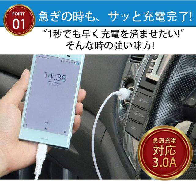 ●iPhone、iPod、Micro-USB、Type-C対応、車のシガーソケットから充電できる車載用充電器です。