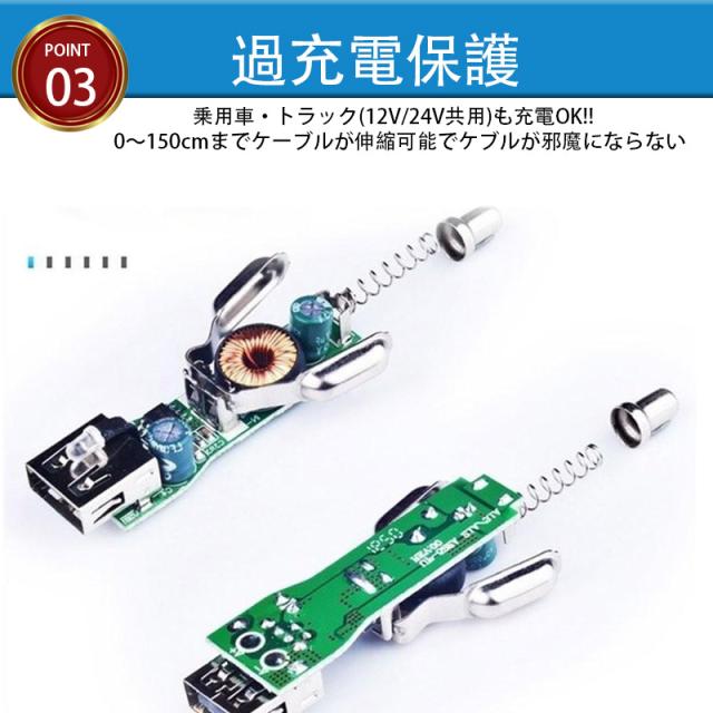 ●乗用車&トラック(12V/24V共用)も充電OK!!0?1.5mまでケーブルが伸縮可能でケーブルが邪魔にならない