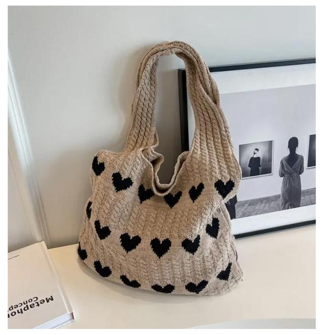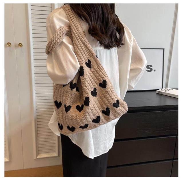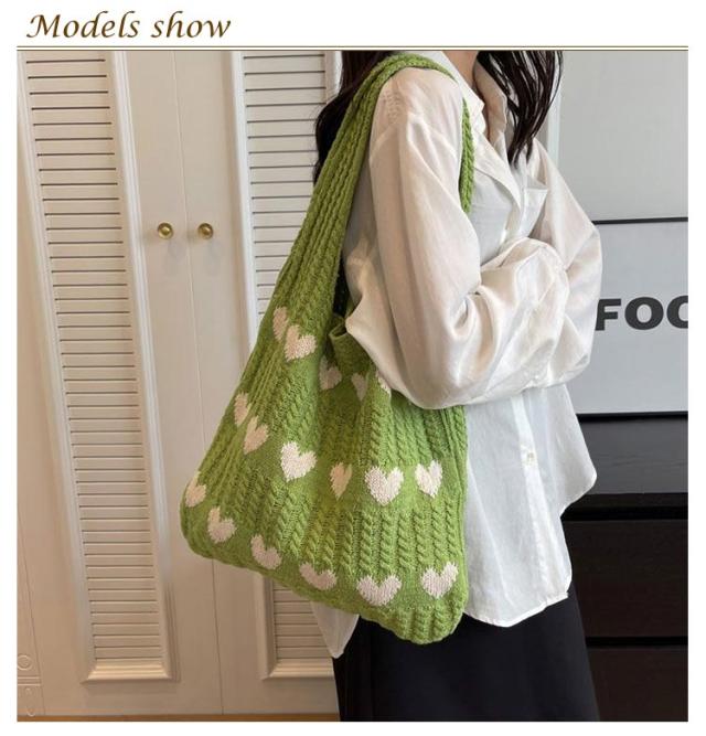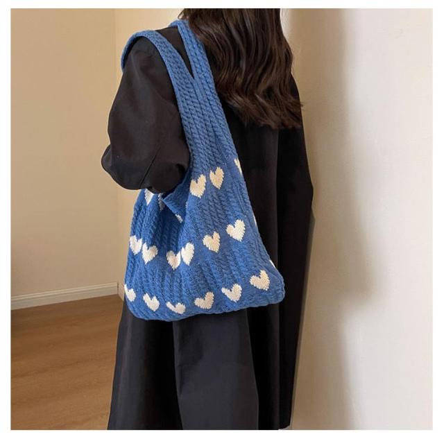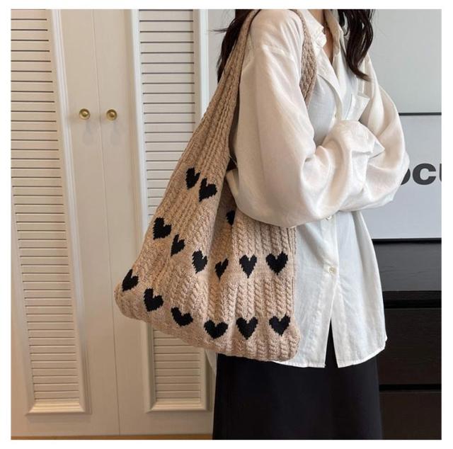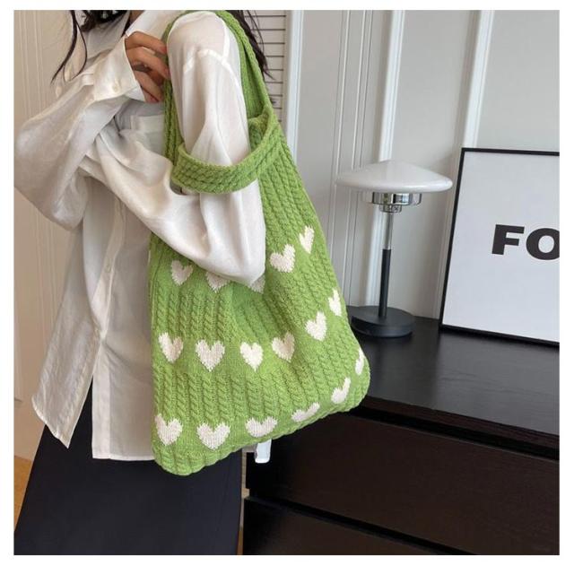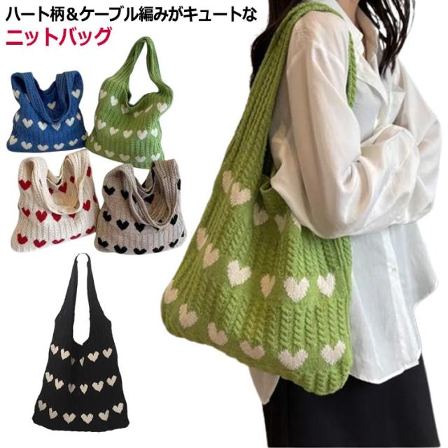 ハート柄 ニットバッグ ハート トートバッグ ニット生地 A4サイズ 収納可能 かばん 鞄 軽量 肩紐 長め 持ちやすい エコバッグ サブバッグ ショルダーバッグ 編みバッグ ニット 大容量 通勤 通学 可愛い 韓国ファッション 送料無料