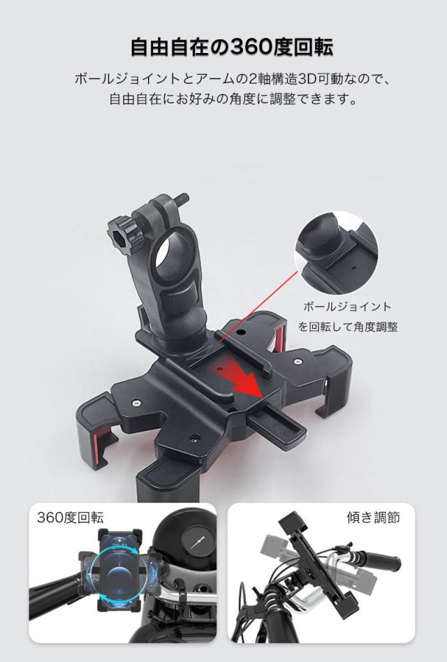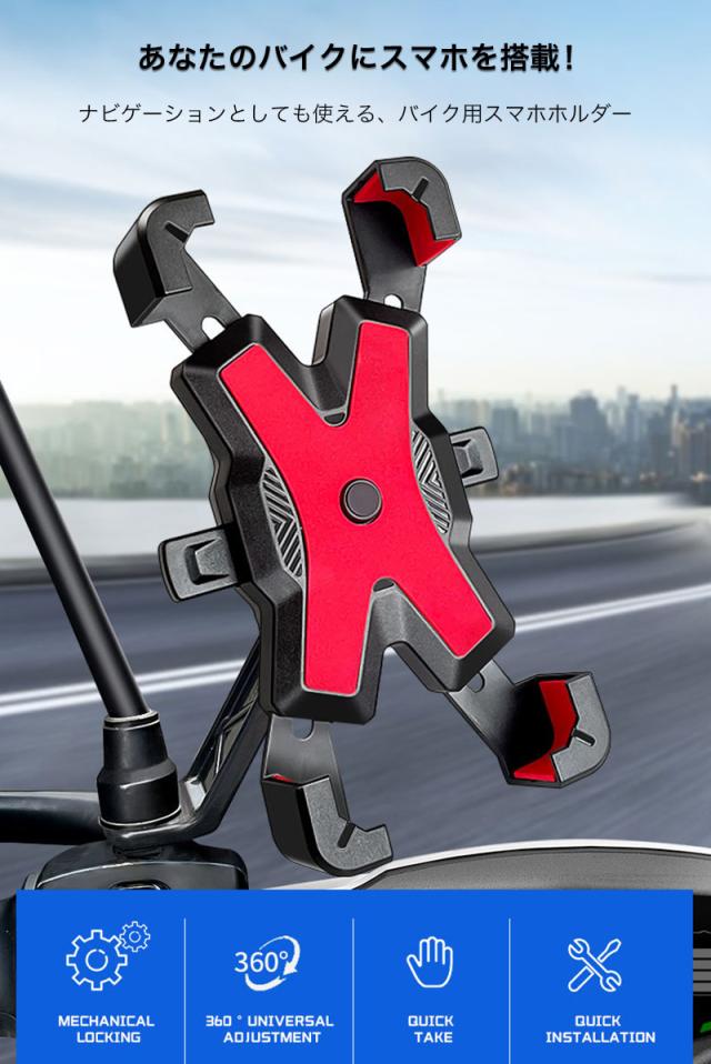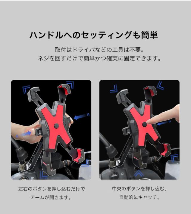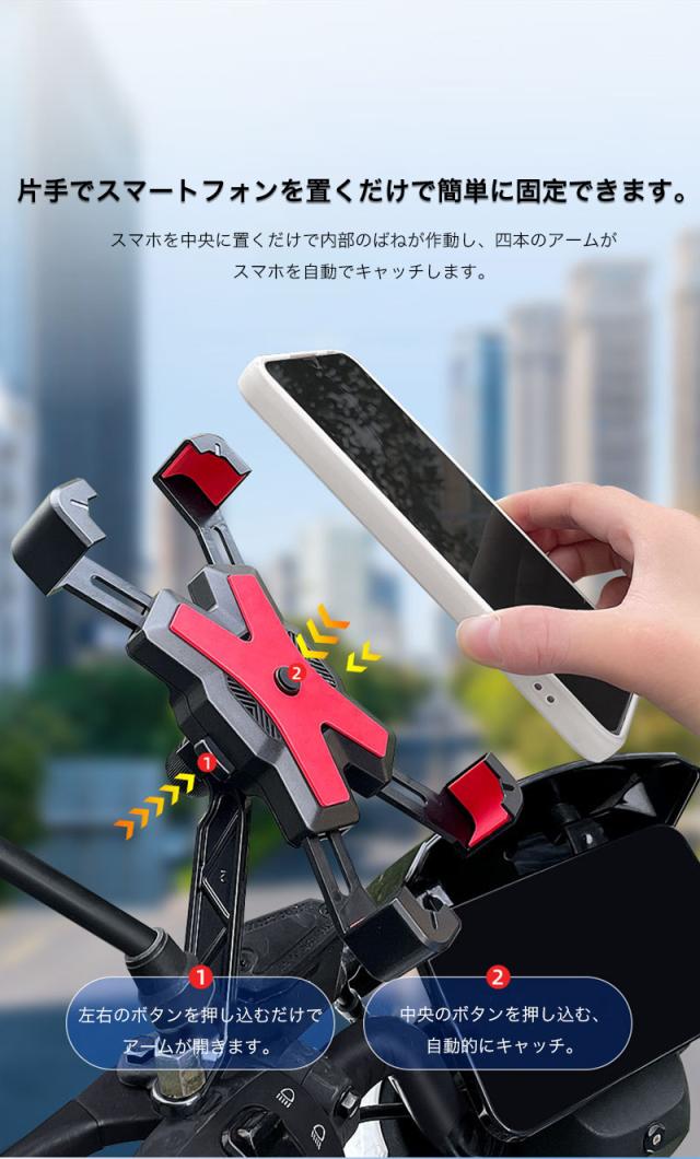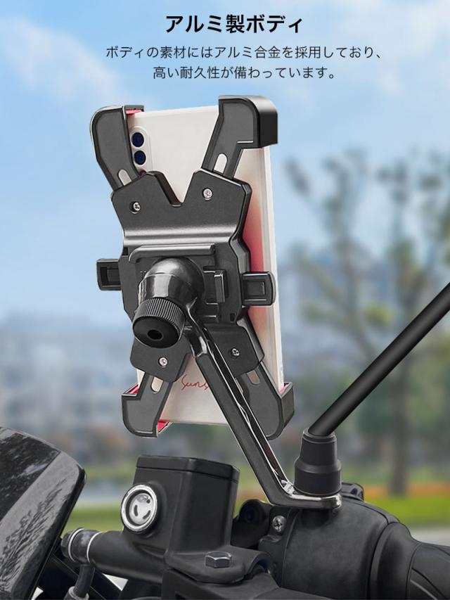 スマホホルダー バイク 自転車 オートバイ スマホ ホルダー スタンド 携帯 ホルダー スタンド スマートフォン GPSナビ 固定 アーム クリップ ツーリング ブレ止め キャンプ 着脱簡単 便利グッズ 4点強力固定 ハンドルタイプ 取付簡単 360度 角度調整 3D可動 片手操作 自動キャッチ 簡単 ナビ ナビゲーション 位置情報ゲーム アルミ合金 メタル 高耐久性 iPhone Galaxy Pixel Xperia 多機種対応