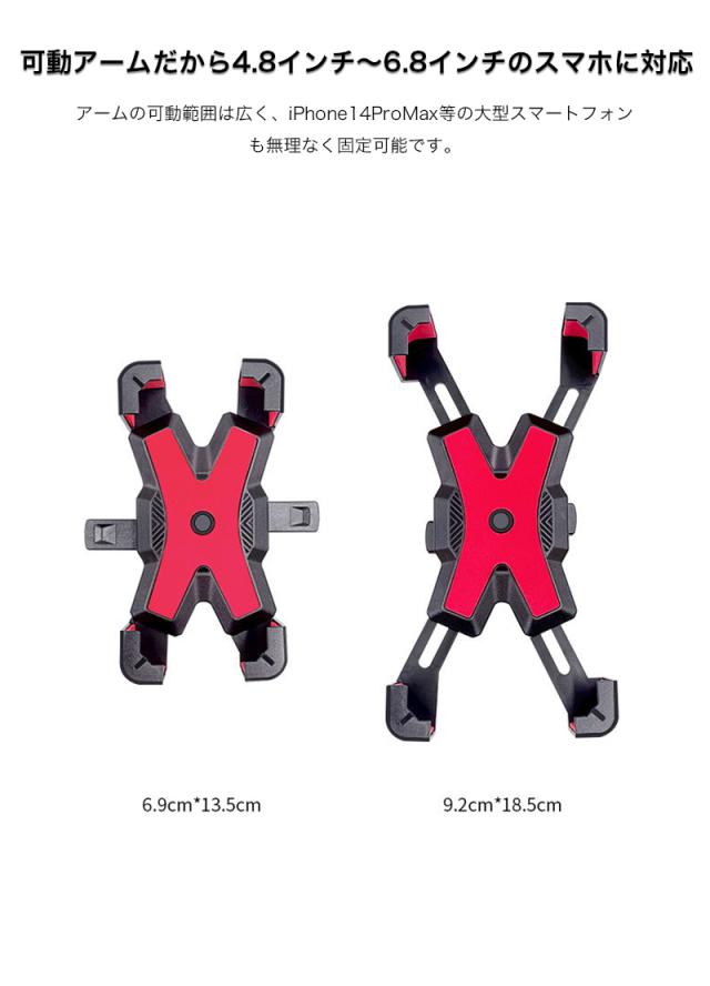 アームの可動範囲は広く、4.8インチ〜6.8インチのスマホに対応し、iPhone14ProMax等の大型スマートフォンも無理なく固定可能です。