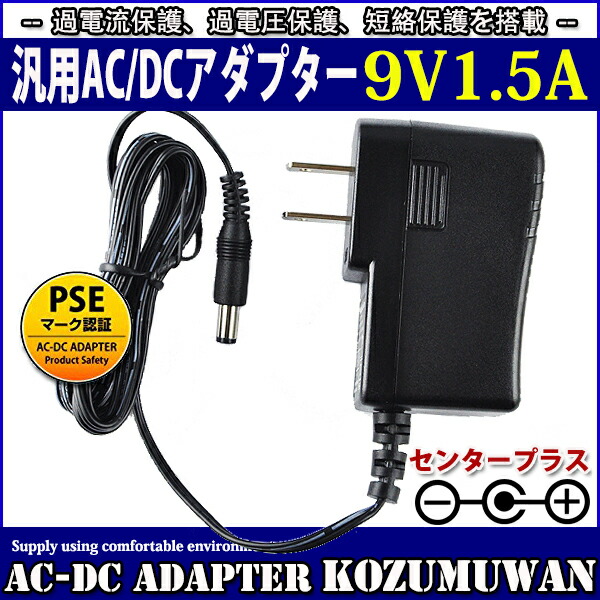汎用ACアダプター 9V 1.5A 最大出力13.5W PSE取得品 出力プラグ外径5.5mm(内径2.1mm) 1年保証付