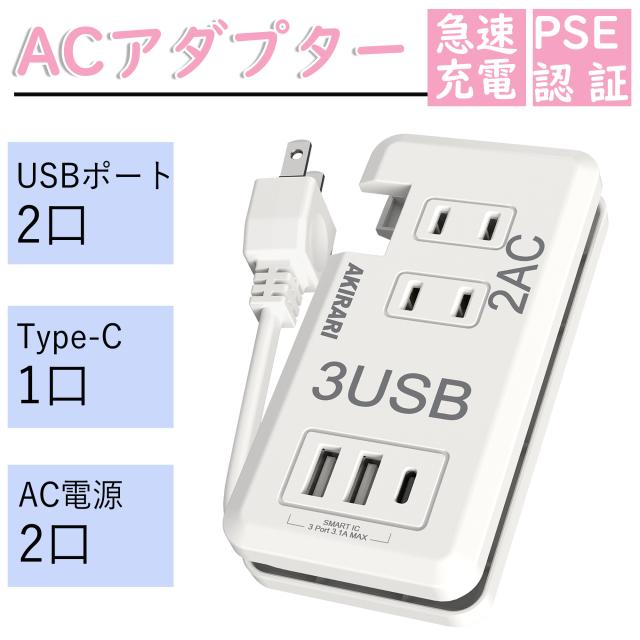 【プレゼントあり!!!】ポータブルコンセント 電源タップ iPhone/スマートフォン充電 ポータブルコンセント ミニ型 USBポート付 電源タップ PSE認証済 (USB2+Type-C1ポート) 充電タップ ホワイト おしゃれ 2個AC口 3個USBポート