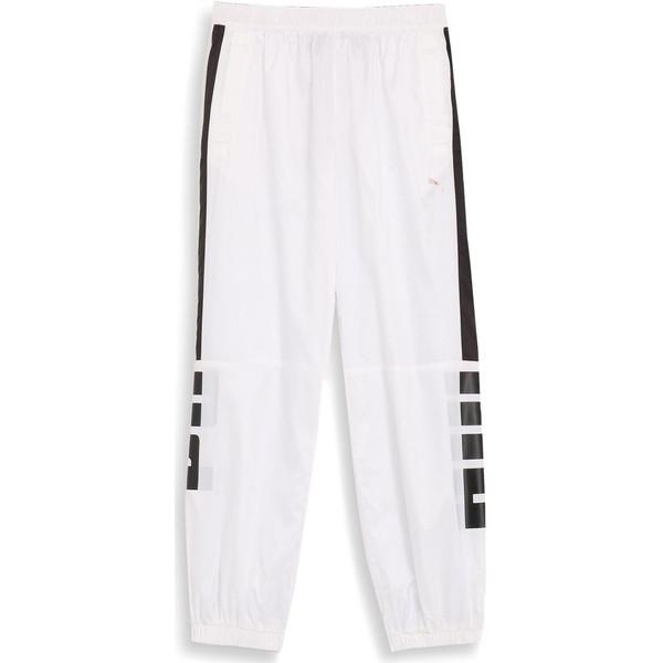 ゆったりシルエット。スポーツブラ、クロップ丈のTシャツやタンクなどとの相性抜群。裾ゴムで足首周りはすっきりと。両サイドのワンラインですっきりとした印象を出しながら、トーナルカラーのPUMAがクールでかっこいい女性を演出。