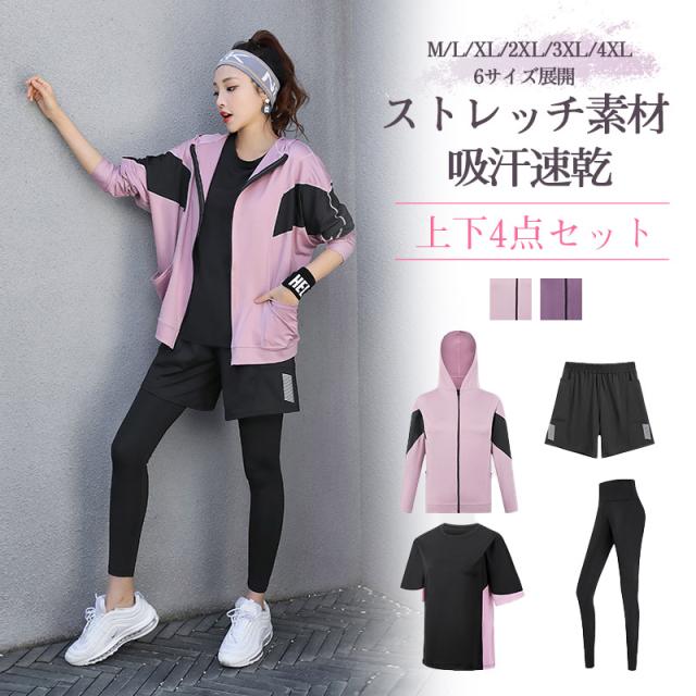トレーニングウェア レディース 上下4点セットアップ おしゃれ ランニングウェア プラスサイズ ゆったり 大きいサイズ
