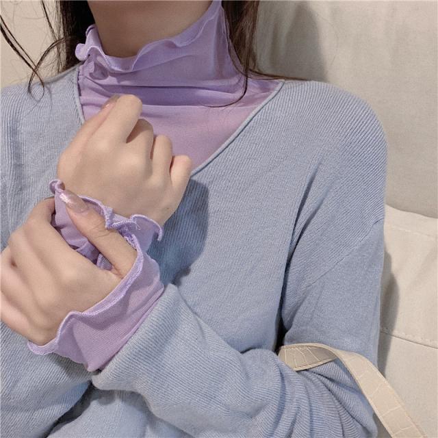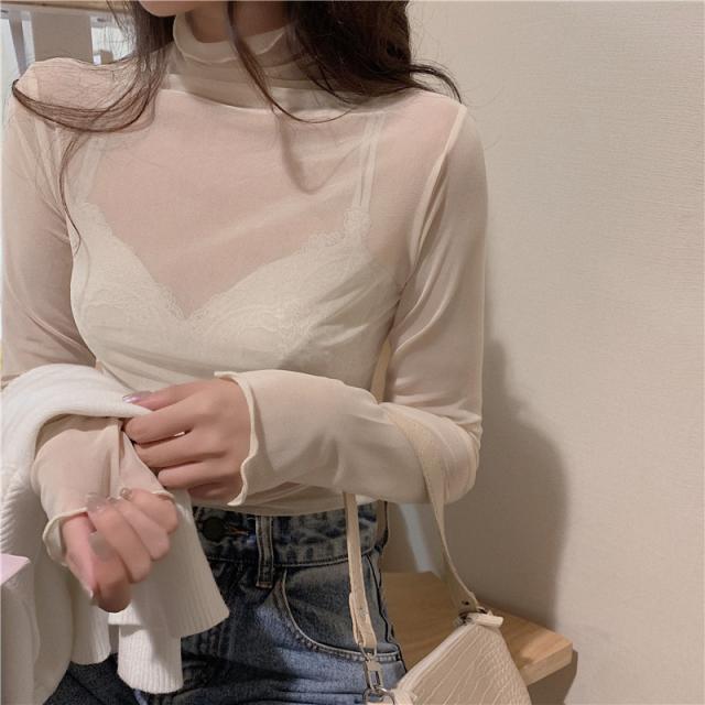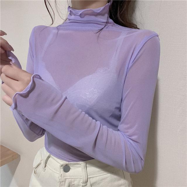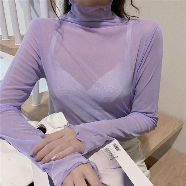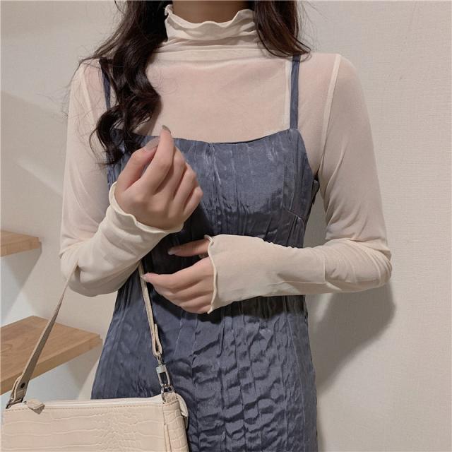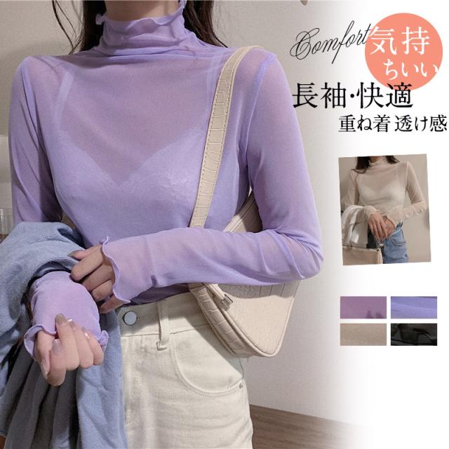 ★限定クーポン有り★tシャツ レディース 長袖 カットソー シースルー ハイネック シアートップス インナー トップス 重ね着 透け感 春 夏