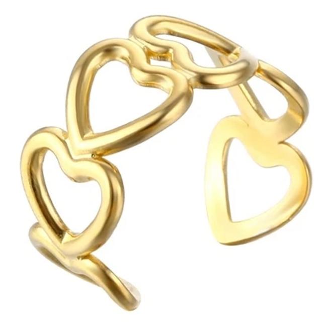 縦に並べたオープンハートが大人可愛いステンレス製の指輪を金色にゴールドメッキしたステンレスリング。