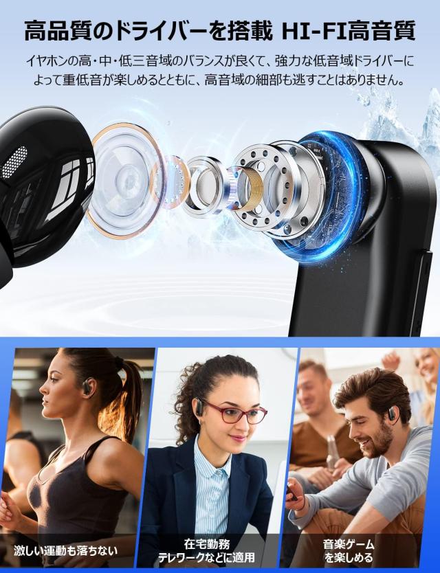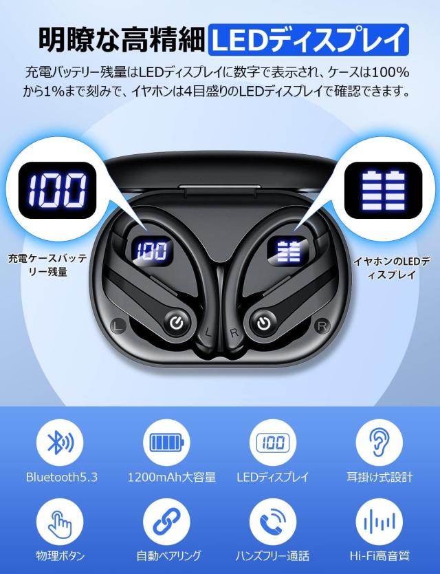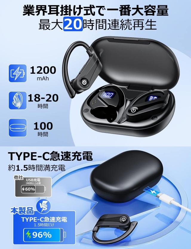 業界最高クラスの高い性能と外観を搭載している耳かけ式イヤホンは2023年にようやく登場しました!【100時間再生可能な大容量バッテリー】この耳かけ式イヤホンの充電ケースは1200mAhの大容量バッテリーを搭載しているため、普通のbluetoothイヤホンより5倍以上の音楽再生時間を実現します!片側イヤホンは18〜20時間の音楽再生が可能で、バッテリーケースとあわせて、合計最大100時間の使用可能です。