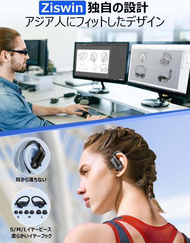 【落ない耳掛け式タイプ】耳掛け式イヤホンは、左右が完全に分離したワイヤレスイヤホンのサイズが合わないと落ちやすいという難点を克服しました。