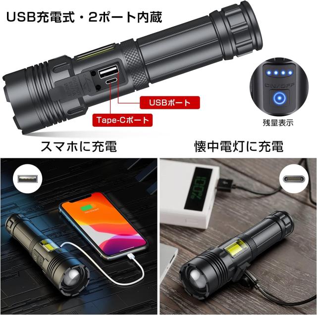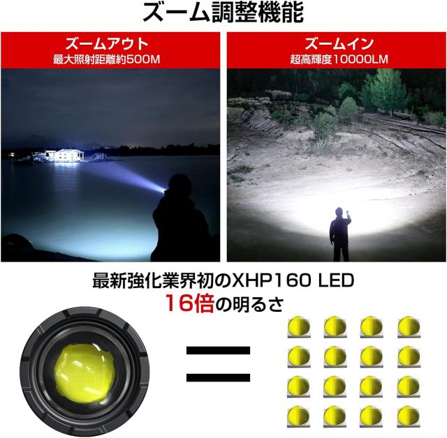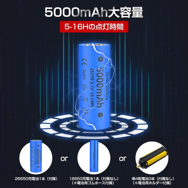 【超高輝度 XHP160LED】懐中電灯 強力 軍用 最強 ハンディライト 充電式/電池式 5000mAh大容量 26650 単