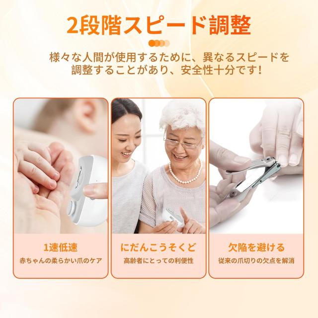 【デュアルスピード調整&高い安全性】この電動爪切りには2つのベロシティがあります、さまざまな人に応じて効率的かつ安全にトリミングするための2つの速度を持っています。