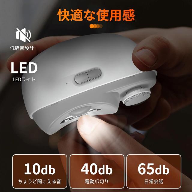 この電動爪切りは超静音設計で、超静音高速駆動モーターを搭載し、パワーは安定し、同時に非常に静かで、使用時の騒音は約45デシベルです。