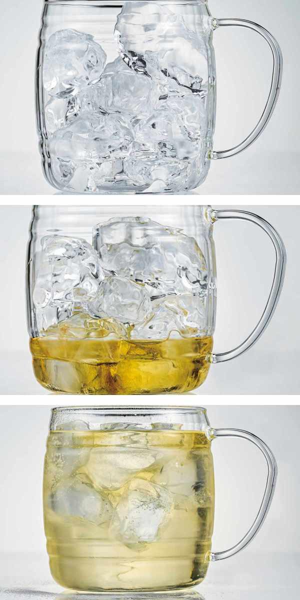 氷をグラスいっぱいに入れ、お酒の原液を下から2番目のラインまで入れます。割材を一番上のラインまで注ぐと、均等に1:3の割合でお酒を作る事ができます。