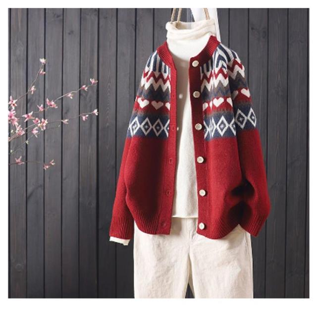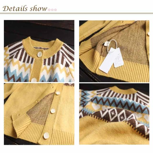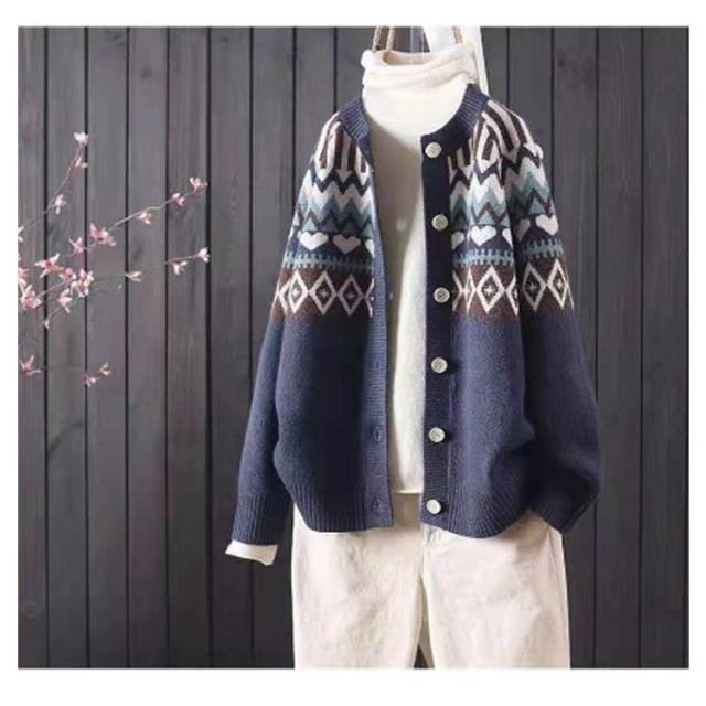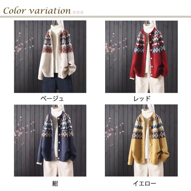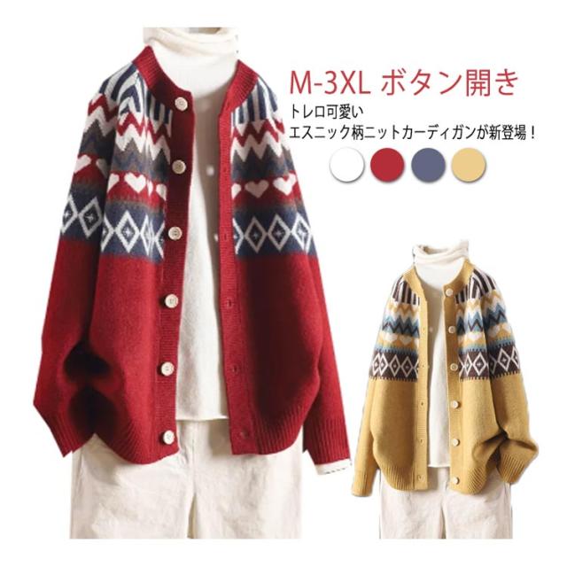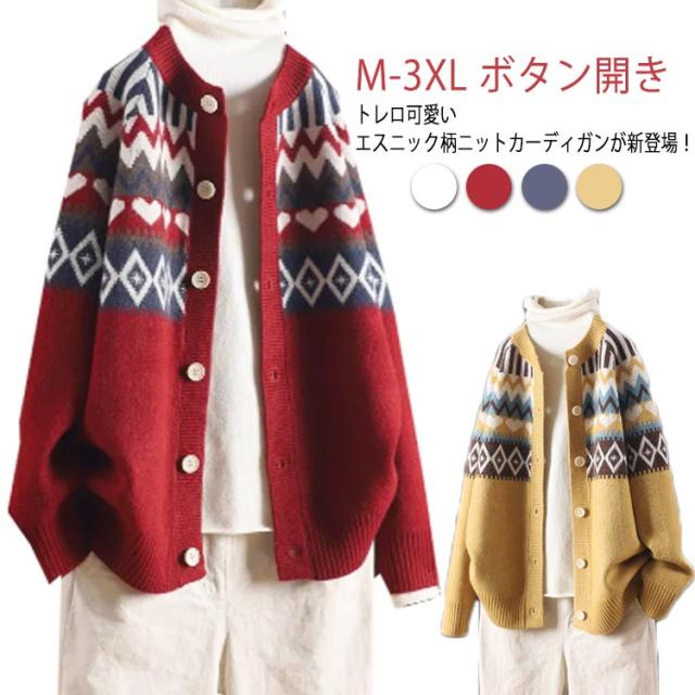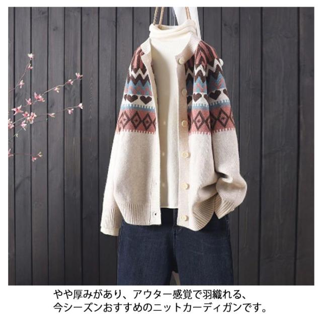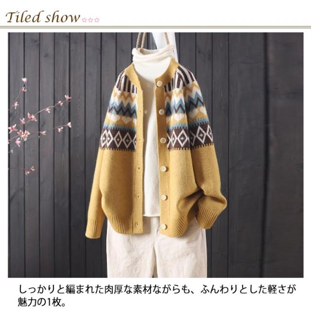 ニットカーディガン 羽織り カーディガン レディース ニットウエア ボタン開き 毛玉になりにくい クルーネック エスニック柄 ゆったり 30代 40代