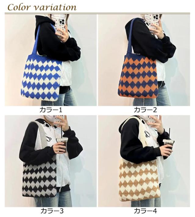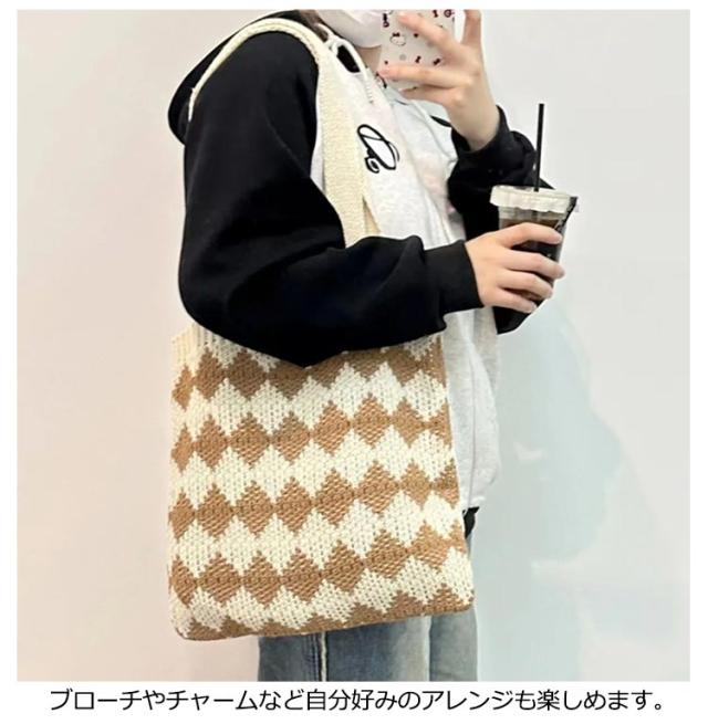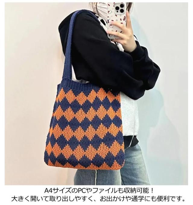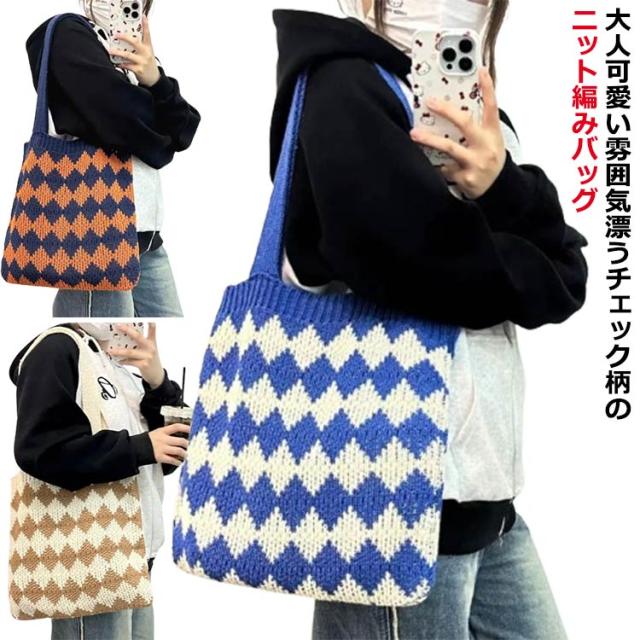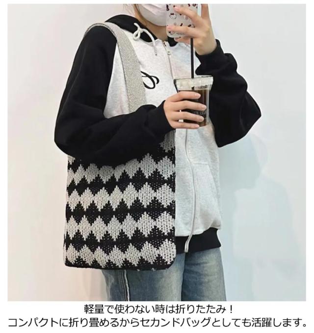 軽量 トートバッグ 柔らか 肩掛け 鞄 A4 サブバッグ チェックニットバッグ チェック柄 ニットバッグ トートバッグ レディース 女性 あみバッグ チェックニットバッグ ナチュラル エコバッグ バッグ ニット編み 折り畳み お洒落 20代