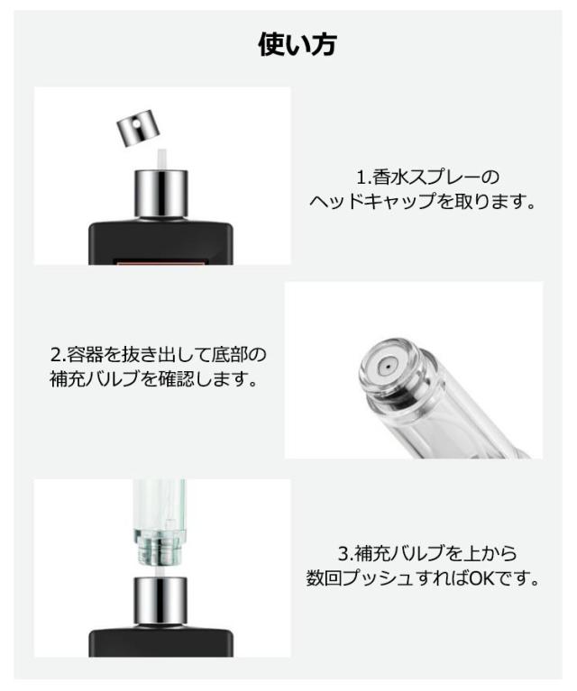| お気に入りの香水をいつでも手軽に楽しめます。 お出かけや・旅行、職場にも、新感覚のクイックアトマイザー。 底部にボトルヘッドをセットして上下にプッシュするだけで充填完了 手を汚さず、こぼすことなく詰め替えることができるようになりました。 また、小さく、軽いので外出時の持ち運びにはとても便利です。 気品あふれる落ち着いたデザイン、大切な人への贈り物にもピッタリ! | |