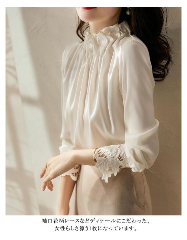 フリルネック レディース シャツ フェミニン フリルネック とろみ 長袖ブラウス ギャザー ボリューム ハイネック トップス タックブラウス オフィスカジュアル OL 通勤 おしゃれ 袖レース 春 夏 シャツブラウス