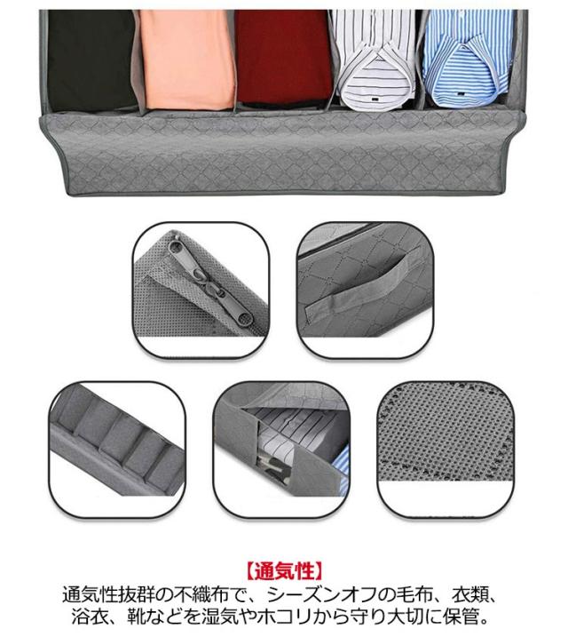 | 【隙間収納】ベッド下のスペースやクローゼットや押入れの隙間などにピッタリな収納ケース。 【通気性】通気性抜群の不織布で、シーズンオフの毛布、衣類、浴衣、靴などを湿気やホコリから守り大切に保管。 【透明窓】透明窓付きで中身が見えるから収納物を探す手間が省けて効率的。 【仕切り設計】仕切り構造で衣類やおもちゃなどを分けて収納できるほか、持ち運び時に衣類がたたみ崩れてしまうのを防ぐのも大変便利。 | |