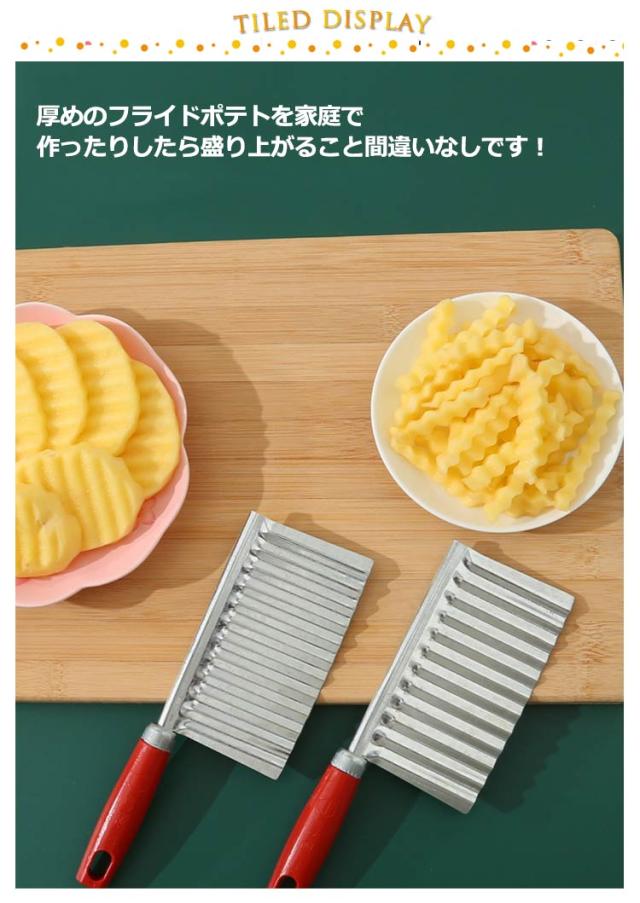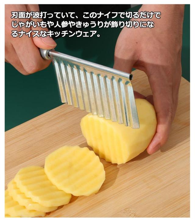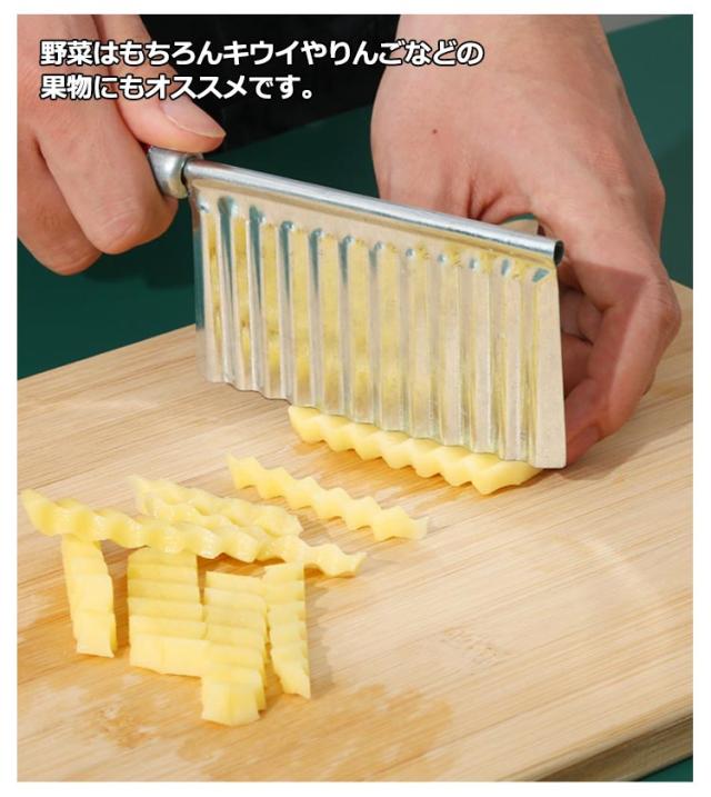 | 普段食べている料理が切り方一つでおしゃれな仕上がりになるのは嬉しいですね。 厚めのフライドポテトを家庭で作ったりしたら盛り上がること間違いなしです! 刃面が波打っていて、このナイフで切るだけでじゃがいもや人参やきゅうりが飾り切りになるナイスなキッチンウェア。 野菜はもちろんキウイやりんごなどの果物にもオススメです。 | |