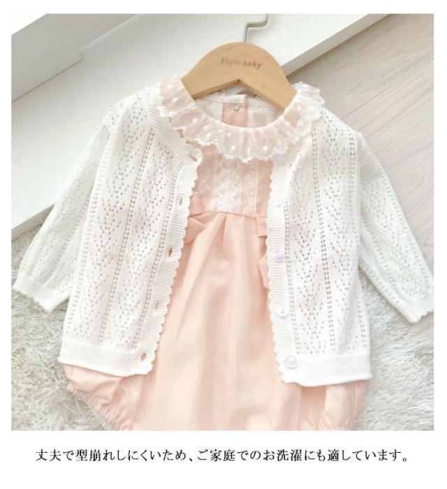 | 季節の変わり目の羽織りアイテムとしてはもちろん、夏の冷房対策にも重宝する前開きカーディガンです。女の子のお気に入ったカラーやベビーからキッズまで着用できる幅広いサイズをご用意して、姉妹や友達お揃いにもおすすめ。 薄手で肌に優しい綿100%を使用した長袖カーディガンが、吸汗・通気性にも優れ、サラッとした着心地です。伸縮性があって動きやすいのも嬉しいポイントです。丈夫で型崩れしにくいため、ご家庭でのお洗濯にも適しています。 シンプルなカーディガンに透かし彫りデザインを施して女の子らしい優しい雰囲気を演出します。フロントは前開きなので着脱や重ね着にもしやすいです。ボタンを開ければ、便利な上着になっています。寒い時期にはアウターのインナートップスとしでも着用できます。 ほどよいフィット感&すっきりシルエットを実現します。スカートにもワンピースにもどんなお洋服にもコーデしやすくで着回し力抜群の女の子用の上着です。 無地だからコーデしやすく、春秋のちょっとした肌寒い季節や夏場のエアコン等場合に冷え対策グッズとして使えるカーディガンです。シンプルな着こなしに一枚プラスするだけできちんと見えるので、普段使い、幼稚園、保育園などの通園や部屋着にもオススメです。 | |