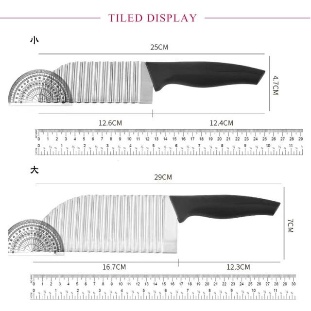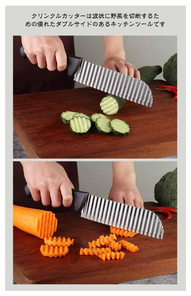 | ステンレス鋼製波型ナイフ。【2サイズあり】 クリンクルカッターは波状に野菜を切断するための優れたダブルサイドのあるキッチンツールです キュウリ、ニンジン、ジャガイモ、または他の種類の野菜をカットするのに便利です。 安全で持ちやすいブラックのプラスティックハンドルがあります。 | |