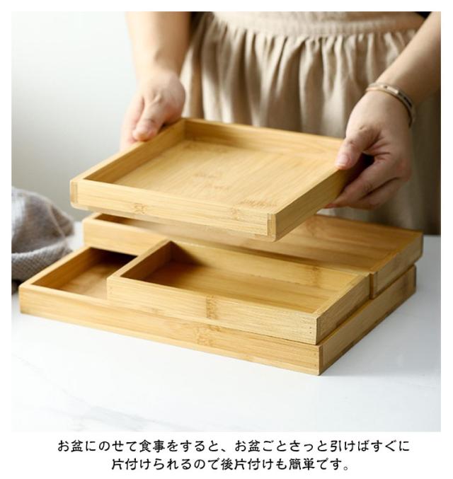 | 手になじむ天然木の温もり。気品あふれる木製のトレーです。 スタッキング性にも優れ、重ねて収納する事ができ、使う人の立場になって大変工夫されています。 ご家庭では、気軽にオシャレなカフェの雰囲気を演出できます。 お盆にのせて食事をすると、お盆ごとさっと引けばすぐに片付けられるので後片付けも簡単です。 | |