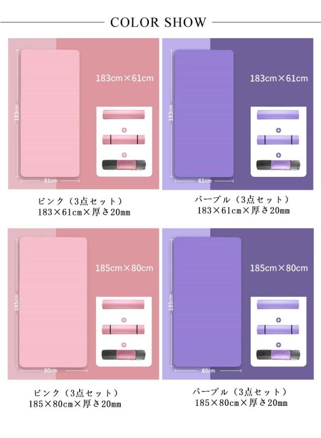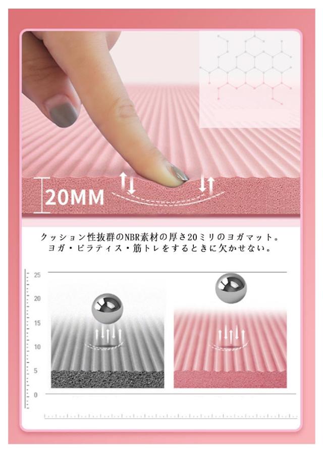 | 3点セット ヨガマット+バンド+収納ケース。 クッション性抜群のNBR素材の厚さ20ミリのヨガマット。ヨガ・ピラティス・筋トレをするときに欠かせない。 ハニカム発泡技術を採用し、高品質NBR素材と結合して製品の弾力性と快適感を高めています。 凹凸表面設計で、効果的に滑り止めできます。地面防音と滑り止め、運動中より安心できます。 厚さ15mmの緩衝作用で、運動中の緩衝力を減らして関節を保護します。 水に強い素材なので、汚れたら濡らしてタオルでサッと拭きでOK。 ヨガ、ストレッチ、筋トレ、プラティ、マタニティヨガ、トレーニングなど。 | |